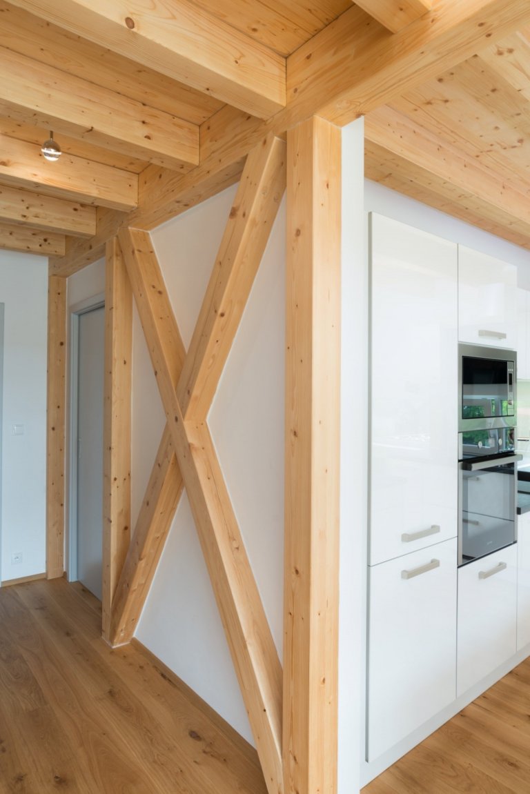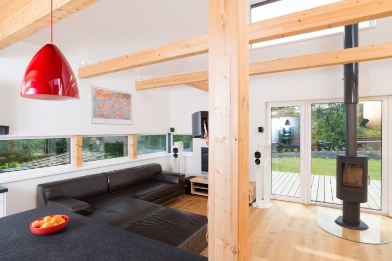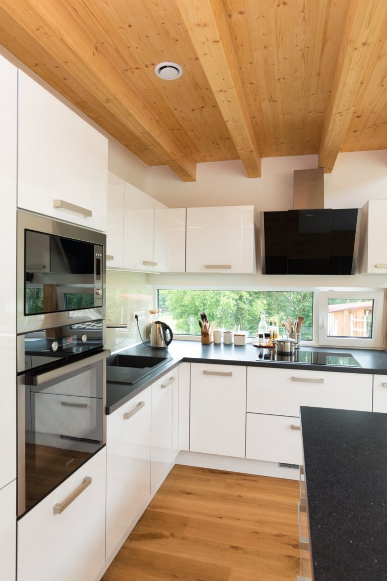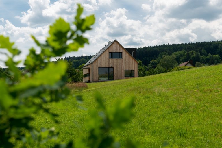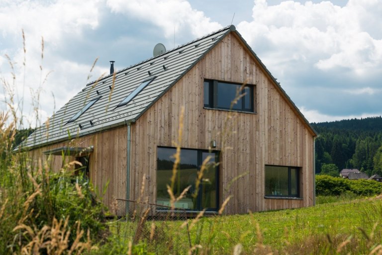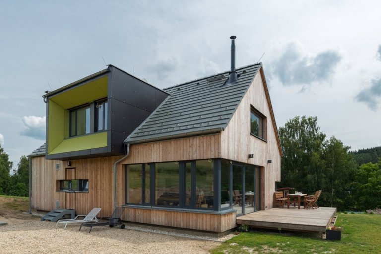 Navrhovaný dům leží v obci Pec, nedaleko Domažlic. Pozemek pro stavbu domu se nachází při severním okraji zástavby obce. K obdélníkovému pozemku z jižní strany přiléhá místní komunikace, která je položena výškově pod úrovní samotného terénu parcely. Stávající zástavba v okolí je volná, rodinné domy jsou obklopeny vzrostlou zelení. K západní hranici pozemku přiléhá volná parcela, kde očekáváme výstavbu nového rodinného domu. Dle předpokladu jeho polohy jsme námi navržený dům umístili na pozemek tak, abychom se otevřeli dálkovým výhledům do krajiny, především však k výhledu na nedaleký kopec Čerchov. Při jihovýchodním rohu pozemku umisťujeme kryté parkovací stání pro dvě auta a sklad. Odtud vede hlavní přístupová cesta na pozemek a ke vstupu do domu. Na straně druhé, u jihozápadního rohu pozemku je terén upraven tak, aby bylo možné vyjet autem na pozemek a k domu. Rodinný dům je navržen jako jednoduchá obdélníková hmota se sedlovou střechou orientována oběma štíty k výhledům na jih a k severu do krajiny. Dominantním prvkem celé kompozice se stává černý vikýř s barevným vyložením umístěný na západní fasádě domu. Dalším zajímavým prvkem je úzké podélné okno prořezávající celou východní fasádu od vstupních dveří přes roh až na fasádu jižní. Do domu vstupujeme přes prostorné zádveří, ze kterého je z hlavní otevřené chodby domu přístupný obytný prostor vlevo a ložnicová část vpravo. Obytný prostor je otevřen do zahrady přes velkou jižní pobytovou terasu. V horním patře jsou potom dva dětské pokoje, koupelna a volná galerie pro různá využití. Významným prvkem interiéru bude dřevěná parapetní lavice kolem jídelního stolu, která je protažena až k jižní fasádě. K uzavření a vytvoření větší intimity pobytové části zahrady mezi terasou a silnicí pomůže vytvoření terénního valu podél jižního okraje pozemku zeminou, která bude odtěžena při terénních úpravách a stavebních pracích. Fasáda domu je z modřínových prken kladených ve svislém směru. Rámy oken budou v tmavé antracitové barvě. Střecha bude provedena z betonových tašek Bramac – tegalit světle šedé barvy. Meziokenní příčky budou obloženy fasádními obkladovými deskami rovněž v antracitové barvě. Vikýř bude obložen také fasádními deskami. Zvenku budou mít desky barvu černou a zevnitř bude vikýř vyložen deskami ve výrazné pastelové barvě – například svítivá zelená, ve variantě deskami v barvě bílé.