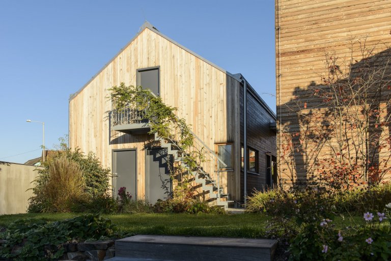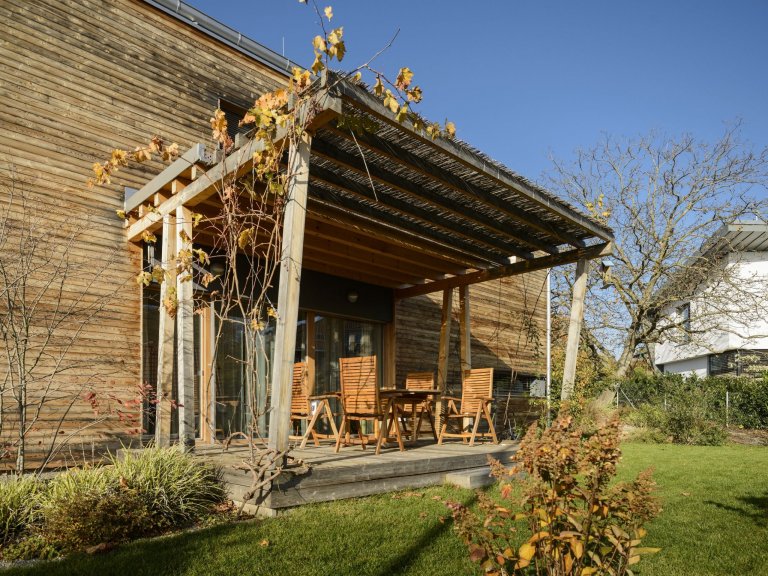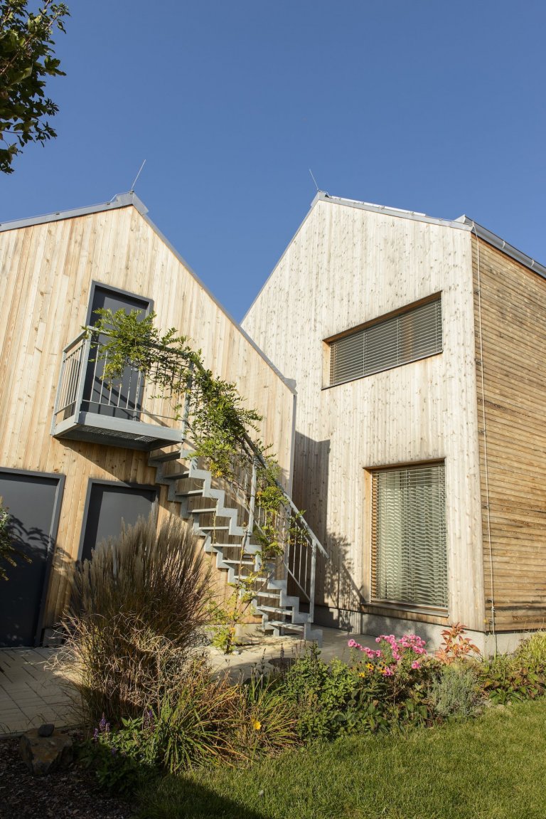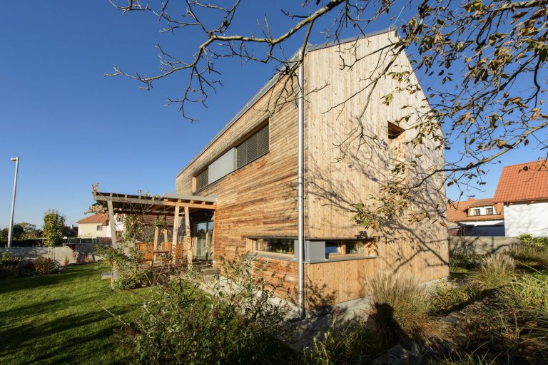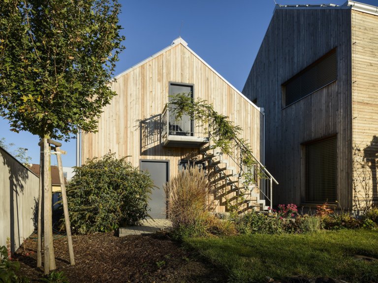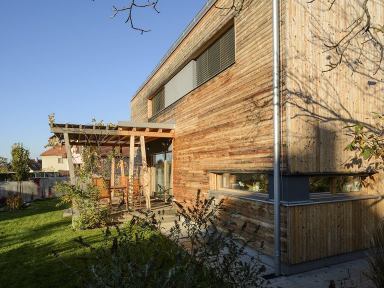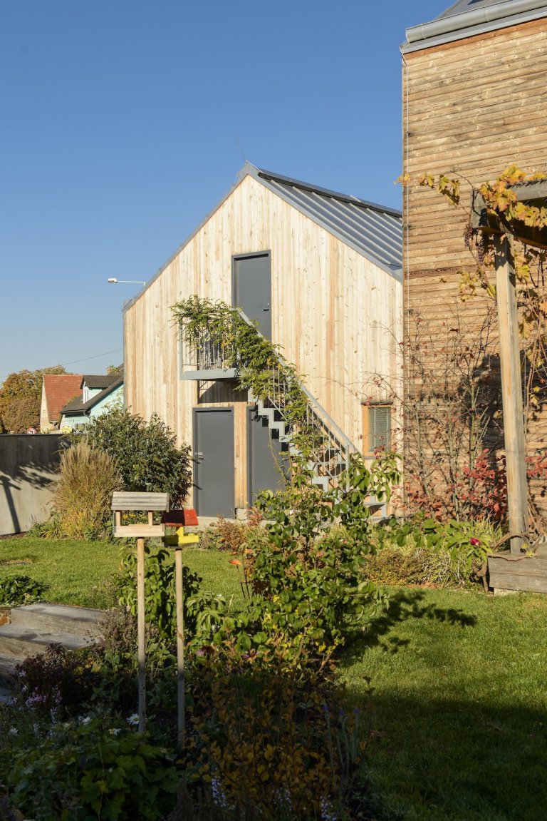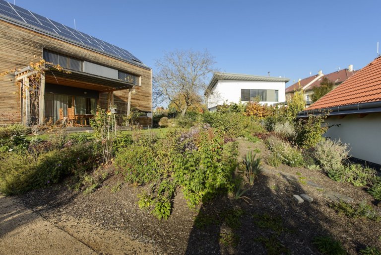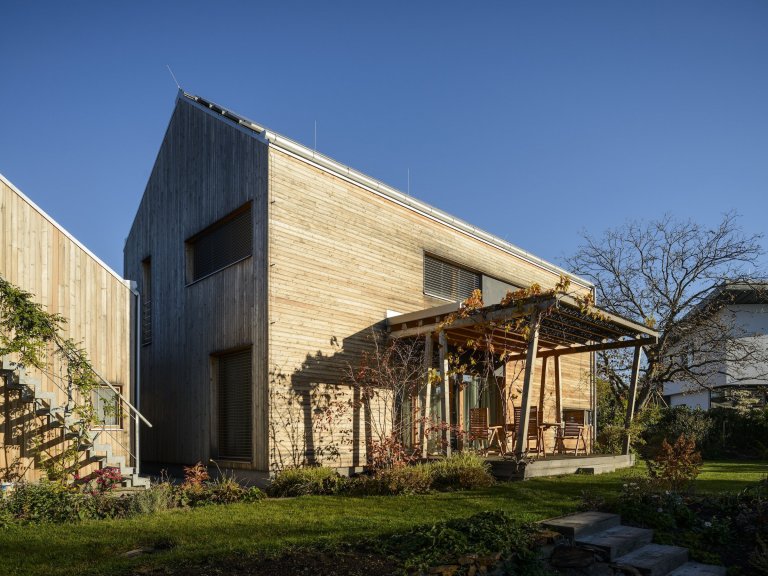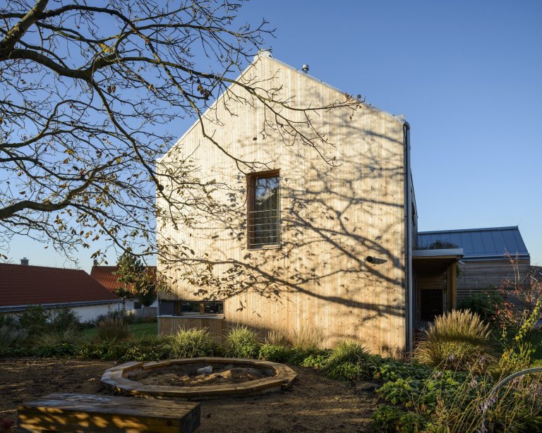 Moderní dřevostavba v pasivním standardu pro mladou rodinu, citlivě zasazená do stávající zástavby historické obce na okraji Prahy, složena ze dvou objektů - obytné budovy doplněné o hospodářský objekt se sklady, dílnou a parkovacím stáním.