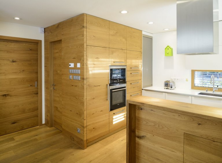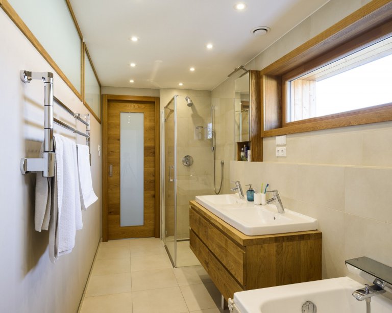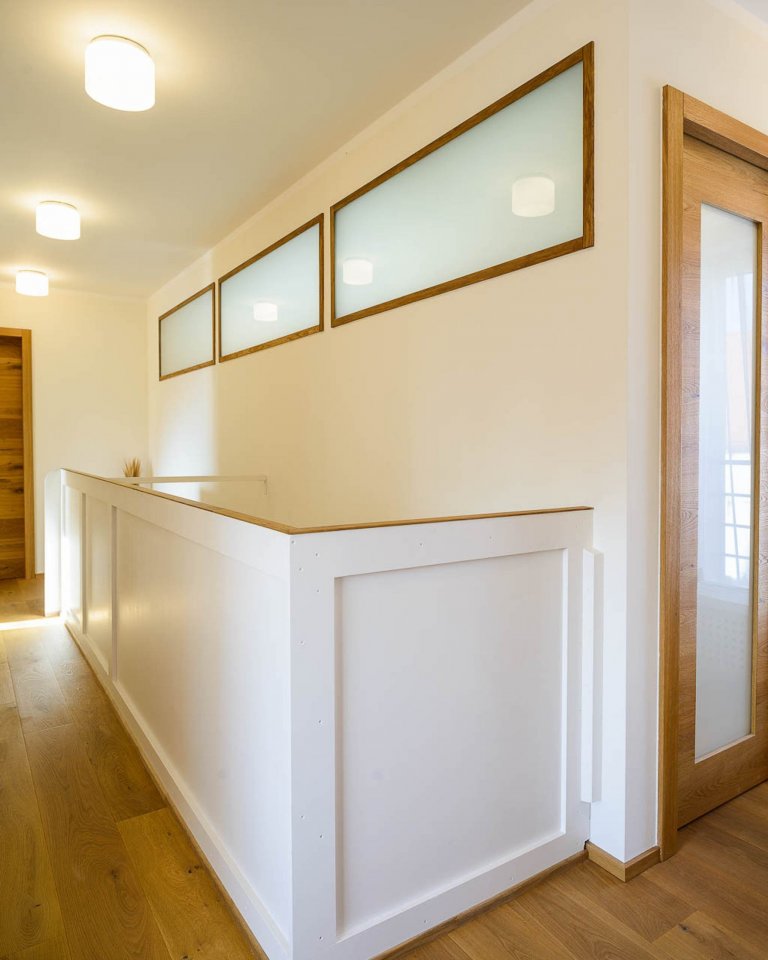 Interiér je elegantní a vyvážený – dominují mu světlé barvy střídmě doplněné dřevěnými prvky. Dispozice domu odpovídá dnešní trendům. Inspirativní je řešení koupelny v horním patře, přes kterou je prosvětlena chodba.