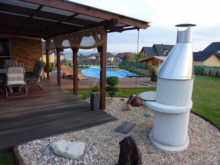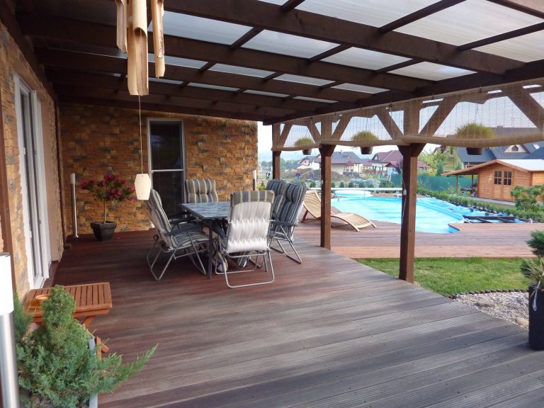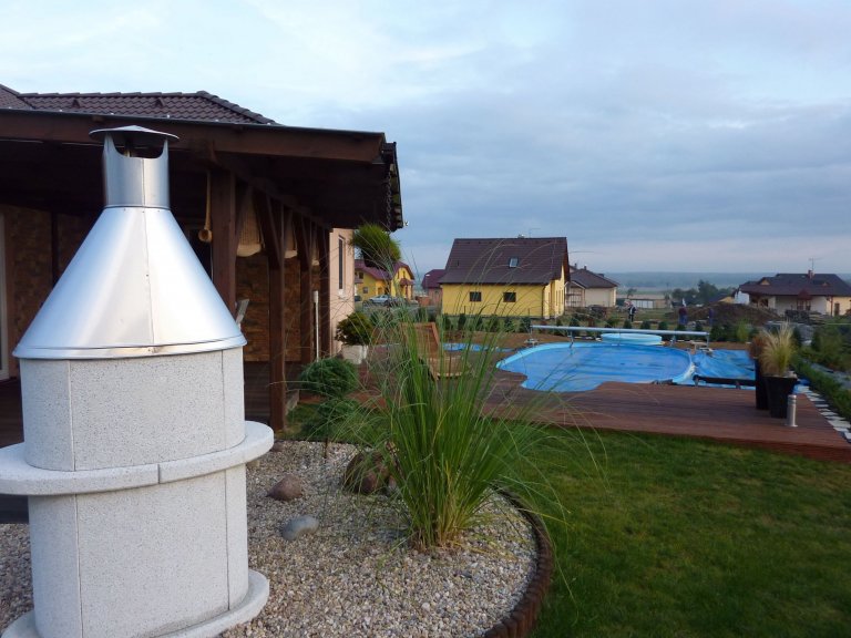 Dům má půdorys tvaru L se zapuštěnou terasou s valbovou střechou se sklonem 25ᵒ. Terasa je zastřešena posuvnými fragmenty. V případě potřeby je možné celou plochu terasy buď otevřít a propojit tak obytnou plochu domu se zahradou. A nebo při zavřeném stavu lze vytvořit v podstatě další obytnou místnost.