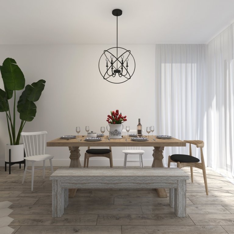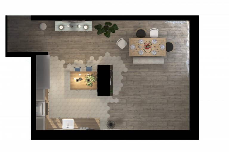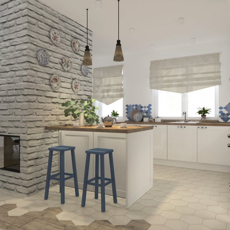 Vidiecka kuchyňa s pultom ktorý slúži zároveň aj ako barový s príjemným osvetlením. Drez s výhľadom do záhrady. Jedálenská časť umiestnená taktiež do presklennej časti obývačky. Dominantou je obklad v kuchyni v tvare rybej šupiny a komoda na mieru v modrých odtieňoch.