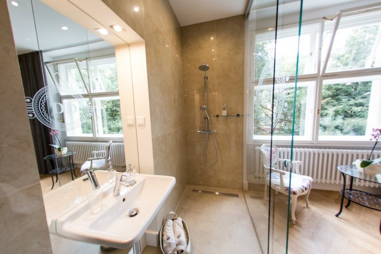 Kompletní rekonstrukce, řešení nové koupelny jako součást ložnice v rodinném domě.