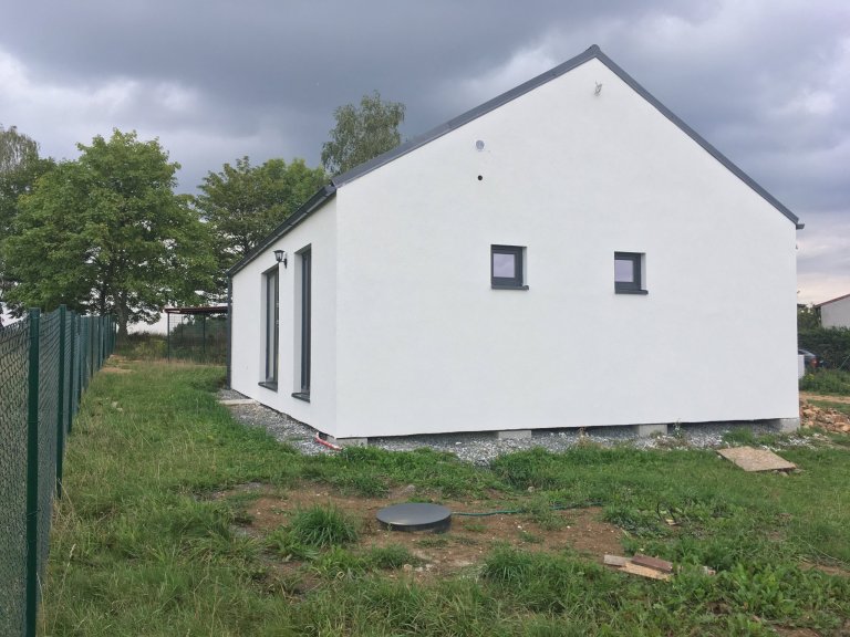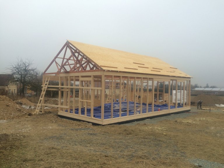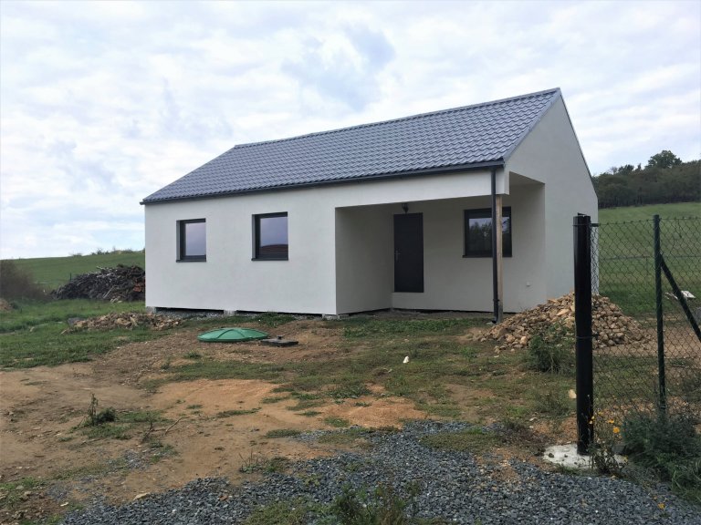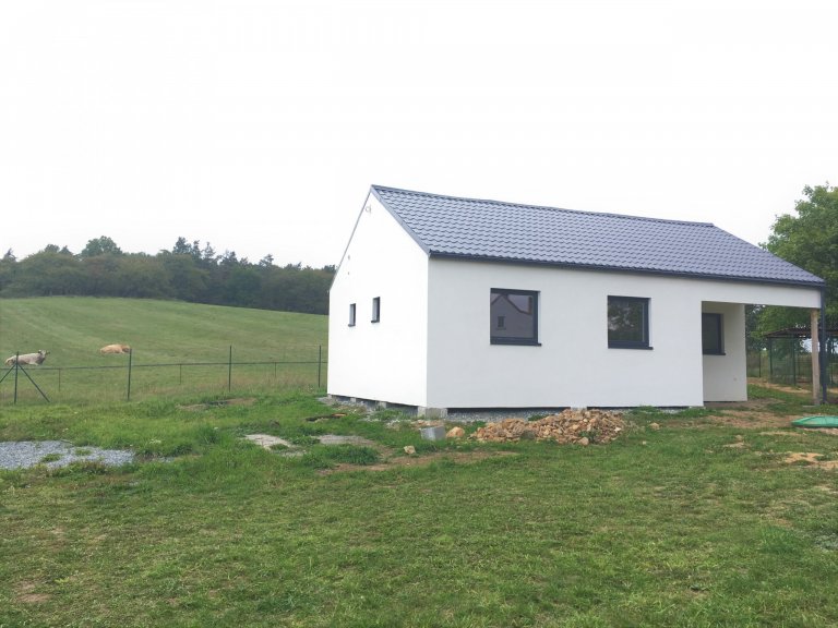 Dřevostavba o zastavěné ploše 85m2 s přesahem střechy tvořící přístřešek ke vchodu dle vlastního půdorysu byla dokončena v roce 2017 v Semněvicích u Horšovského Týna.