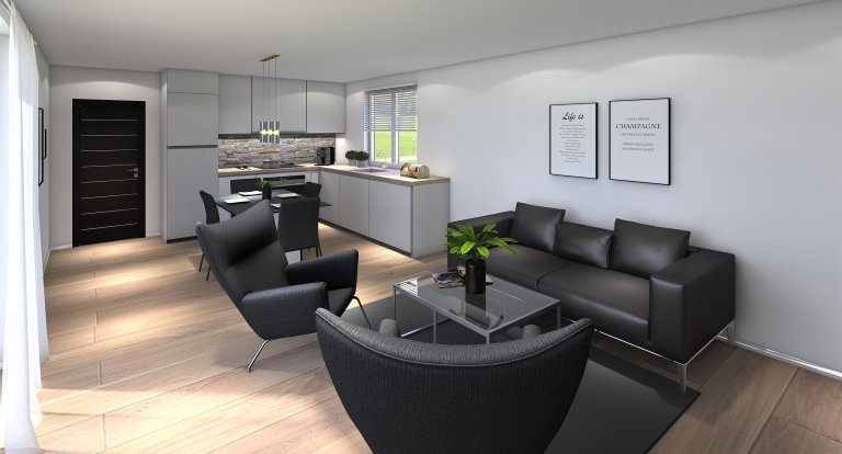 Tato modulová dřevostavba do tvaru L je vhodným řešením pro klienty, kteří požadují garáž spojenou s domem pro parkování automobilu či umístění zahradních strojů a nářadí. Místo garáže lze tuto část nahradit plnohodnotnou ložnicí, pracovnou či jiným pokojem. Dominantou této modulové dřevostavby je balkón, na který lze vstoupit z ložnice. Tuto dřevostavbu doporučujeme např. pro rodinu o 3-4 lidech.