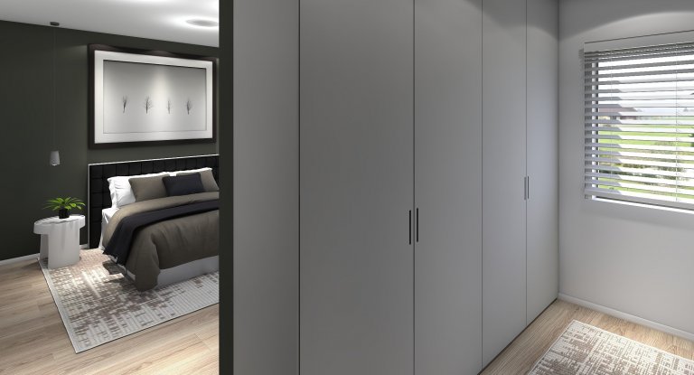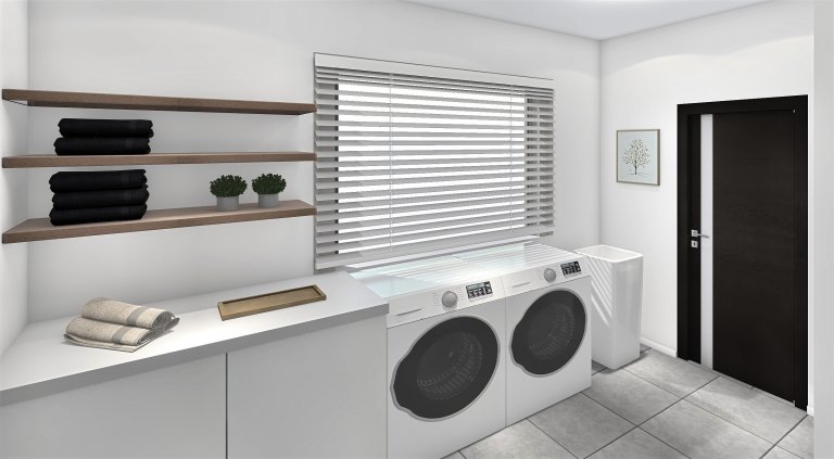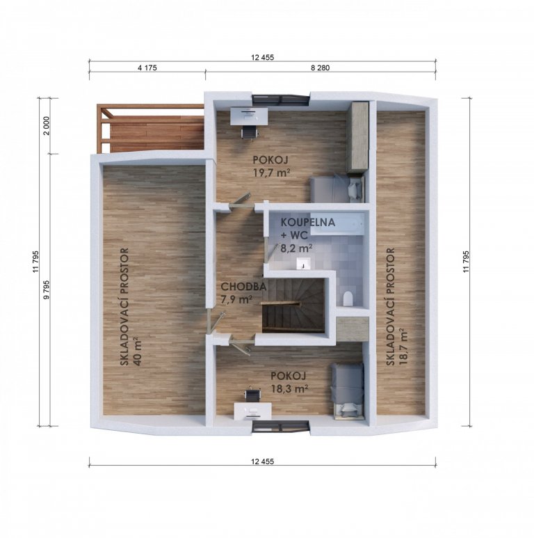 V horním patře jsou umístěny dva pokoje a koupelna a místnosti se zkoseným stropem po obvodu domu je možno využít jako úložné prostory, skladovací místnosti či zázemí pro fotovoltaické panely.