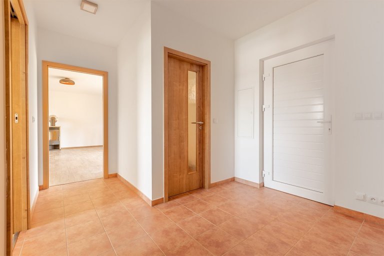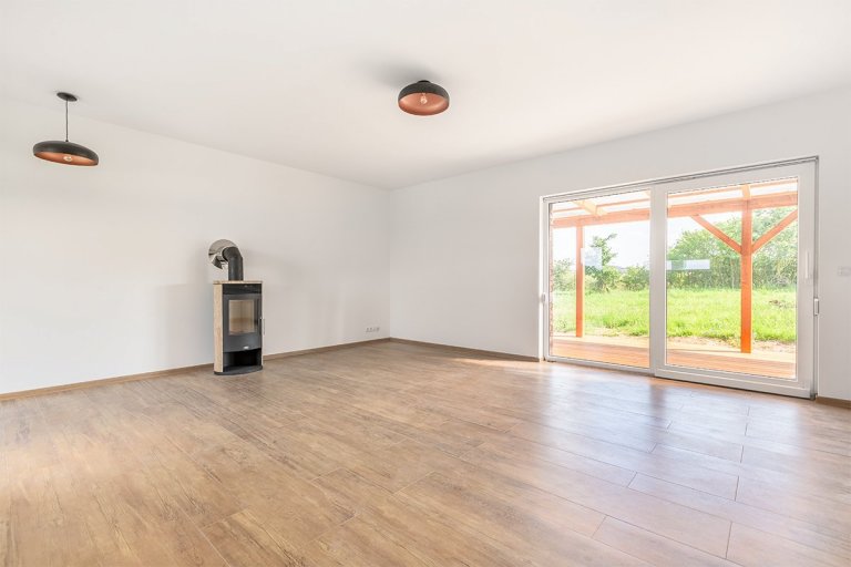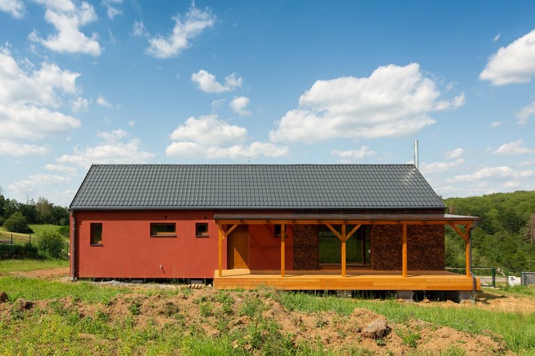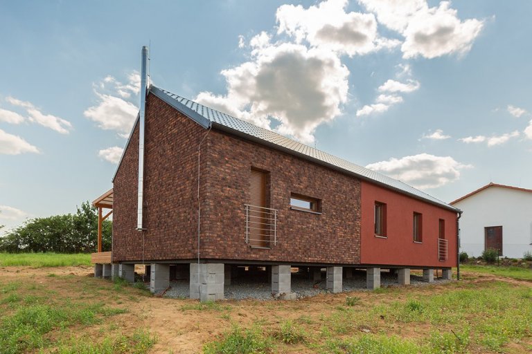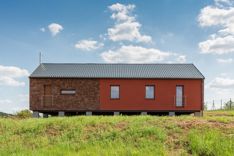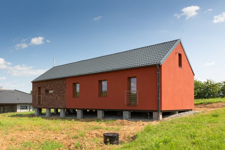 Nedaleko Plzně v krásné vesničce Nebílovy jsme v letošním roce zhotovili oblíbenou typový bungalov Easy 96. Dominantou této obdélníkové dřevostavby o půdorysu 16x6m je vínová fasáda s obložením cihlovými páskami. Vzhledem k velmi svažitému pozemku jsou spodní základové patky zesílené a navýšené. Interiér je laděn do přírodních barev, na podlaze dominuje velkoformátová dlažba. Kuchyňskou linku si investor zajišťoval vlastní cestou.