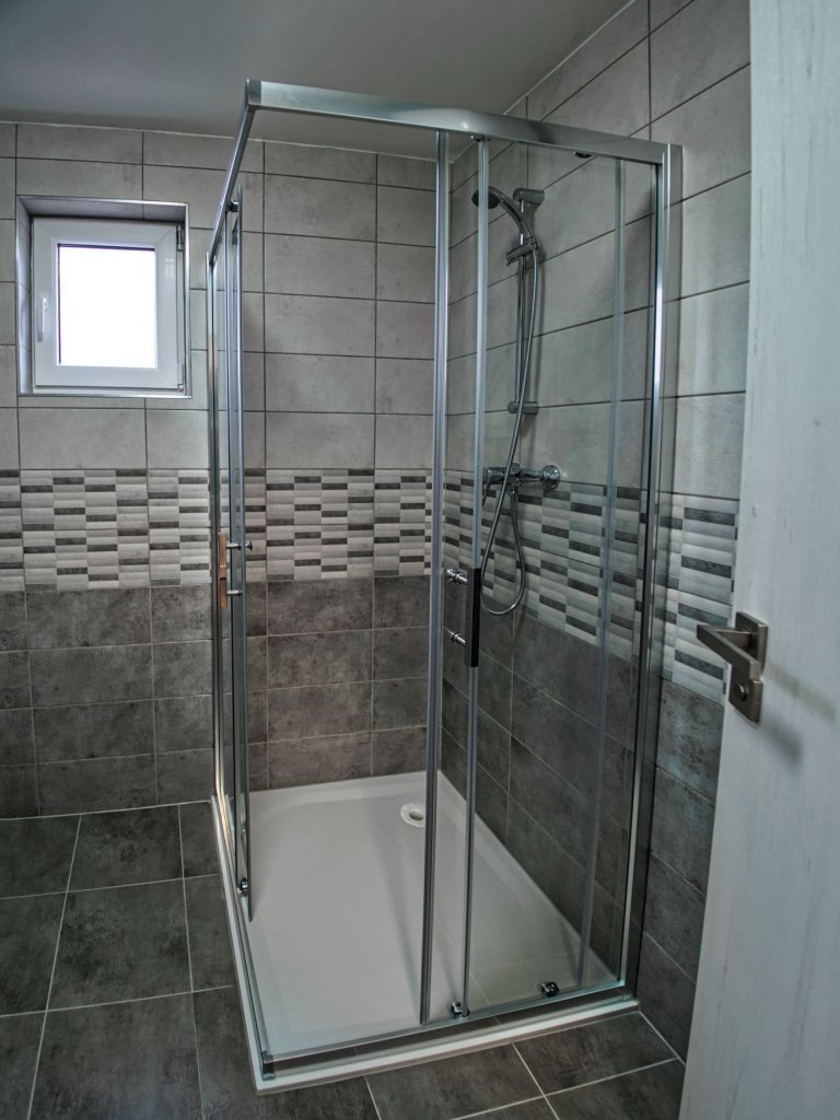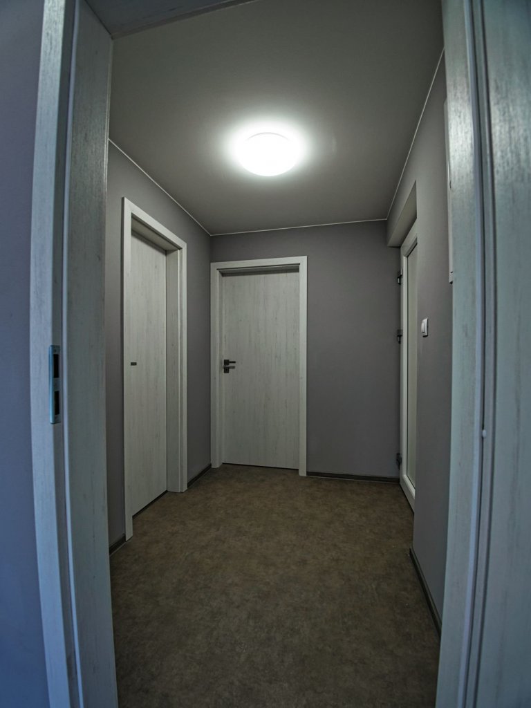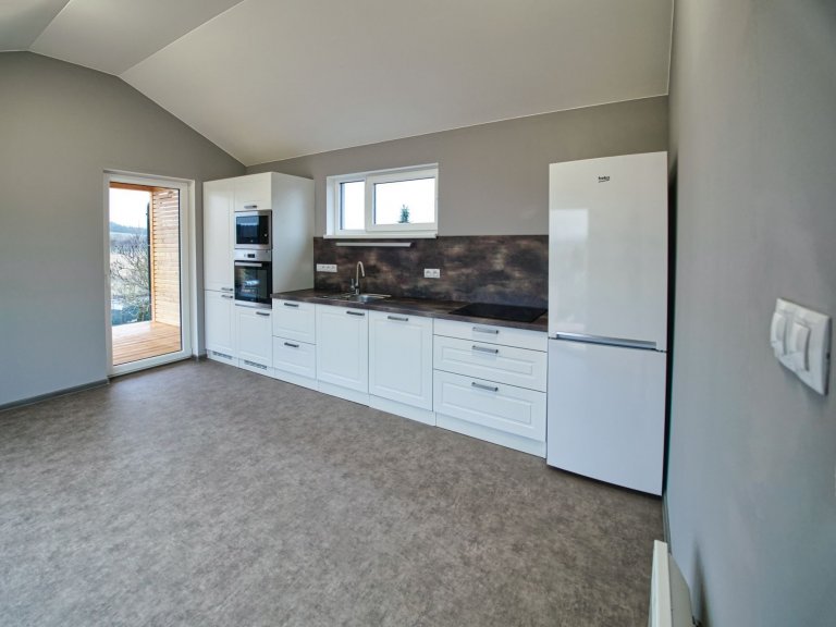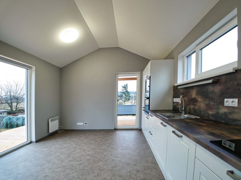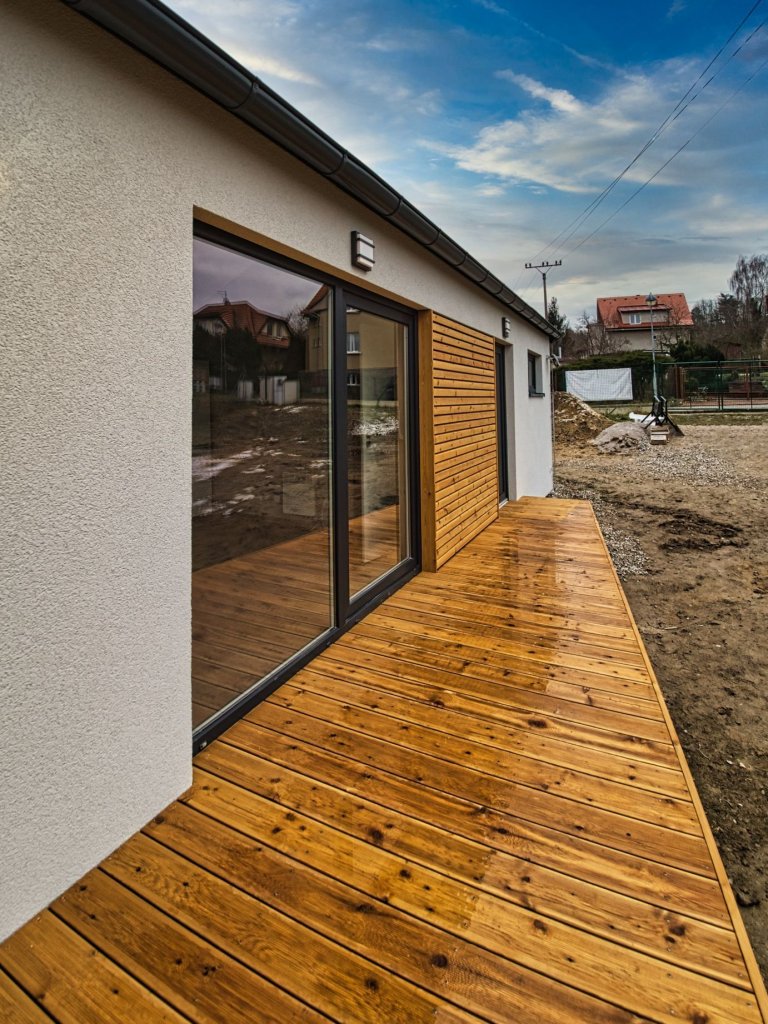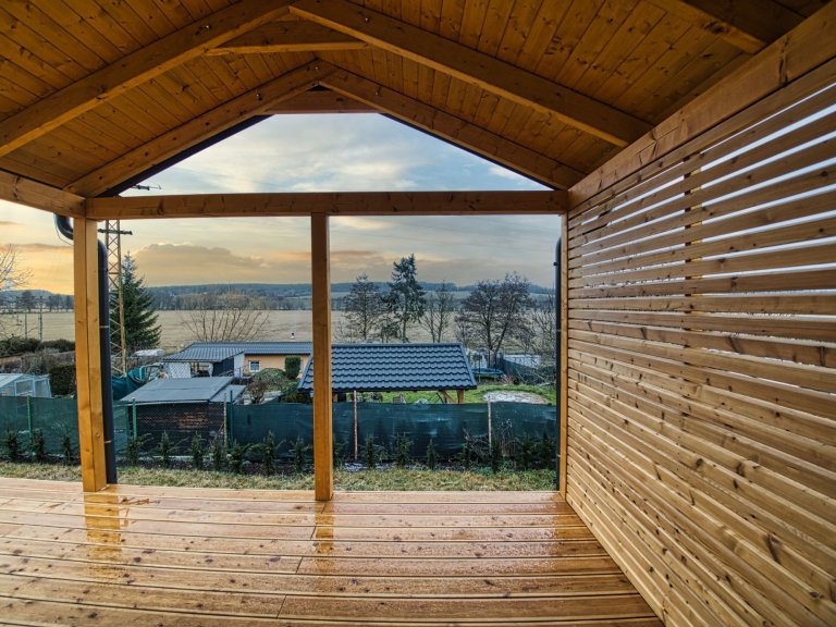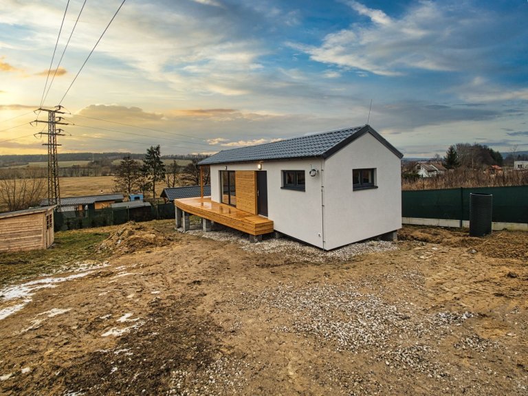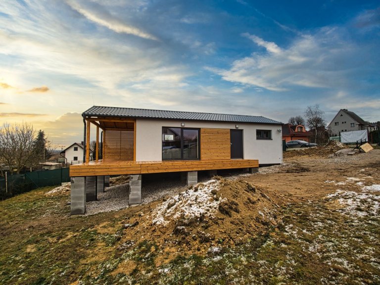 Dřevostavbu Easy 40 jsme postavili na velmi svažitém pozemku v Záluží, jen přes křižovatku od naší výrobní haly. Po dokončení stavby včetně terasy s pergolou, která prodlužuje obývací část a nabízí krásný výhled, se zhotovilo ještě zábradlí k terase, schody, lavička na terasu ze sibiřského modřínu a na závěr fasádní sokl, který zakryl vysoké betonové základové patky. Dřevostavba v interiéru laděná do šediva bude využívána k rekreačním účelům.