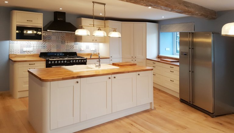 Kuchyně v krémové barvě s rámovými dvířky a dubovou pracovní deskou.