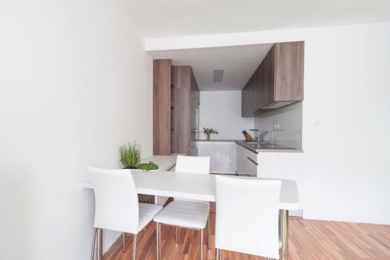 V rámci nového návrhu kuchyne sme sa rozhodli túto priečku úplne odstrániť, celý priestor otvoriť a vniesť do nej denné svetlo. Zmena dispozície nám umožnila prepojenie priestoru jedálne a kuchyne a tým aj odstránila pôvodné obmedzenia, ktoré predtým znemožňovali lepšiemu využitiu priestoru. Pri návrhu sme volili kombináciu bielej farby s vysokým leskom a tmavších odtieňov dreva.