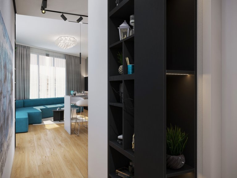 interiér pre aktívného klienta s dominanciou minimalistického prevedenia s výraznou farbou sedačky, doplnená kovovými…