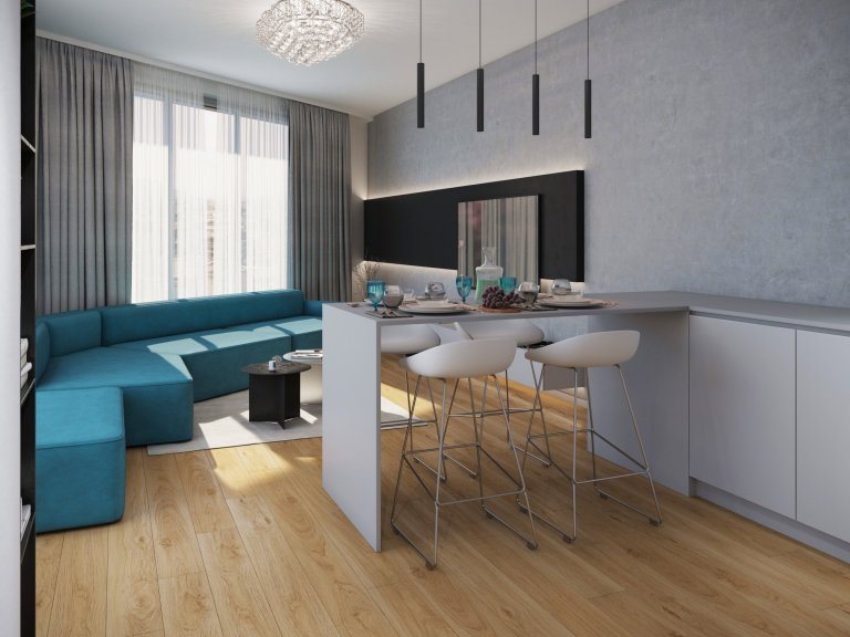 Kuchyňa s obývačkou v SKY PARKU , stavba navrhnutá ZAHA HADID.