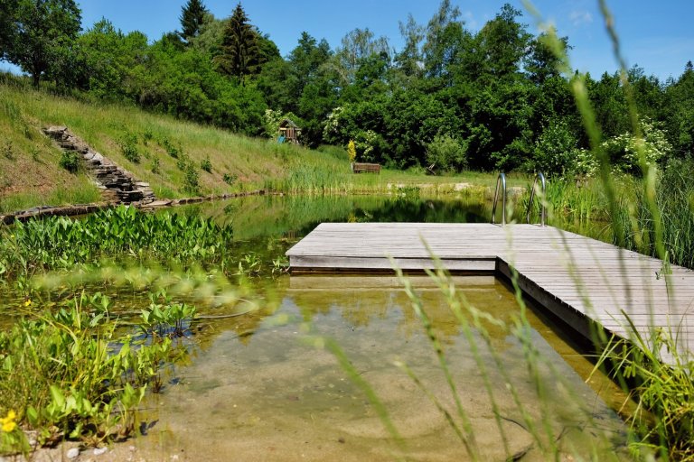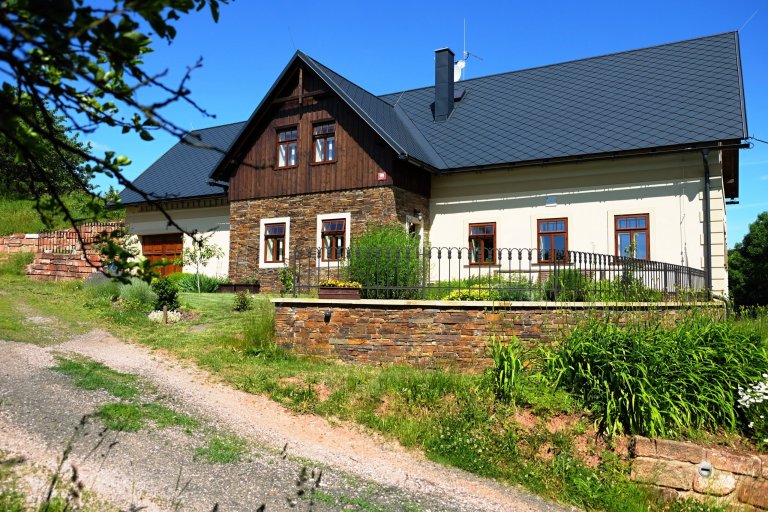 Neoplocená zahrada kolem domu navazuje na rozsáhlé louky a les. Na pozemku za chalupou je dětské hřiště, otevřené ohniště, velké koupací jezírko a uzavíratelný zahradní altán pro 18 osob s výsuvnými okny a kovaným krbovým grilem.