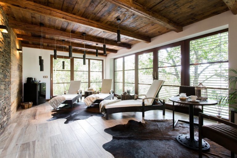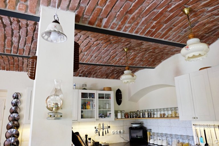 V interiéru převládají přírodní materiály. Podlaha je z masivních dubových flošen a kolem kuchyňské linky přechází v keramická dlažbu s povrchovou imitací dřeva. Nábytek je z větší části připraven truhlářem na míru, masivní jídelní stůl a židle jsou z jasanového dřeva. Hloubka parapetu u špaletových oken dána šíři zdí je úctyhodná, a sama okna s výhledem do zeleně díky jejich počtu a jemnému řemeslnému provedení, jsou dalších charakteristickým prvkem místnosti.