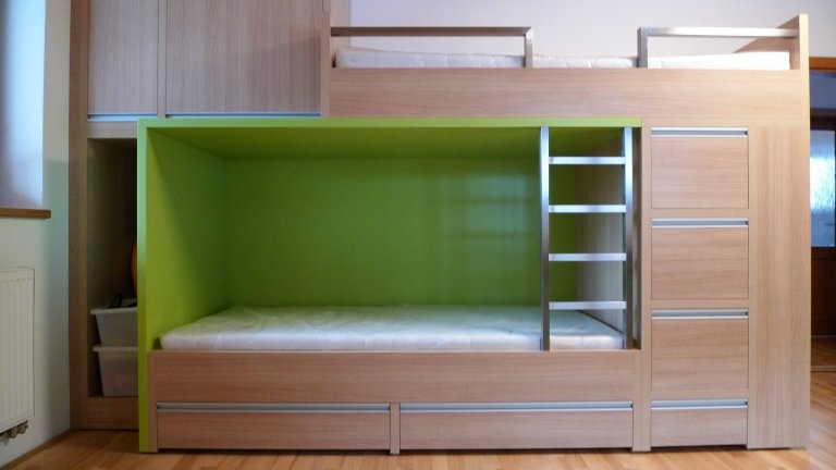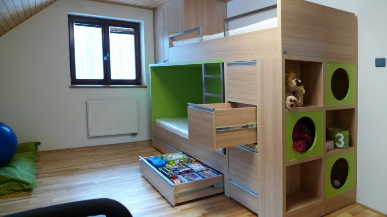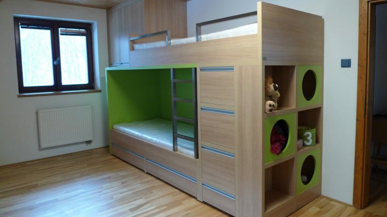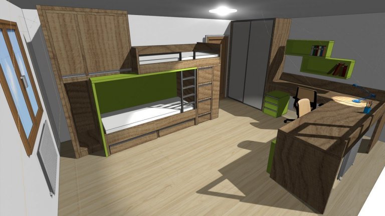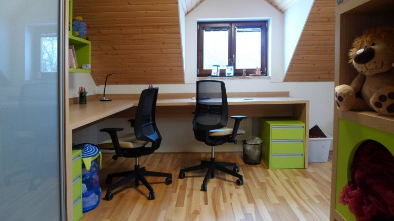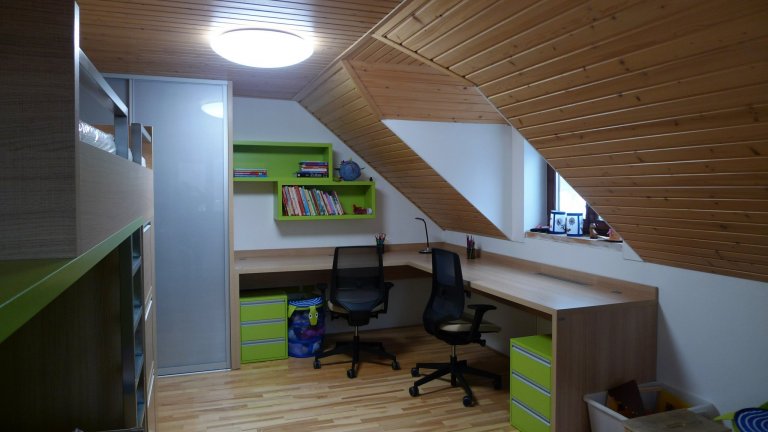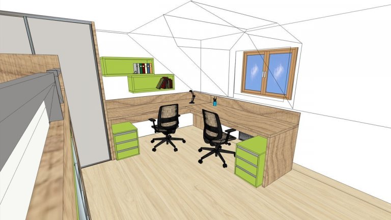 Na začátku roku jsme dokončili "úpravu" dětského pokoje pro dvě holčičky ve věku 8 a 5 let. Tato úprava probíhala tak, že když jsme přišli pokoj v podkroví zaměřit, bylo jasné, že se bude jednat o kompletní předělání, což samozřejmě nebylo v tu chvíli vůbec jasné. Ovšem náš návrh celkového řešení oba investory, milý manželský pár, natolik zaujal, že se s ním s malinkými změnami ihned ztotožnili a s řešením i materiálovým výběrem souhlasili. Postup byl jasný, Zaprvé zaměření podkroví 3D laserem. To je zásadní a musí být více než 100%ní. Je to skvělý základ pro úspěšnou realizaci. Návrh řešení prostoru, který nám trochu komplikoval požadavek, aby nebyly postele v rohu mezi okny kvůli podzemní proudům, Dopadl výborně. Výroba standardní způsobem, ovšem všude ABS hrany na PUR lepidle, které je voděodolné. Téměř vše je navrženo z dvojité síly lamina. Technologie frézovaných zámkových spojů nám umožnila vyrobit skládačku, kterou jsme otestovali na dílně. Montáž zabrala 2 dny včetně vynošení do patra:) Třešničkou na dortu je LED světlo, které má mnoho funkcí.Umí měnit teplotu osvětlení, má mód spánek a nebo hvězdné nebe. Děti jsou nadšené a v tom případě jsme i my spokojeni. A míříme do ložnice a na chodbu, kde je další prostor pro naši práci. Židle LightUp z produkce Profim, Moc pohodlné, příjemné a funkční, záruka 5 let.