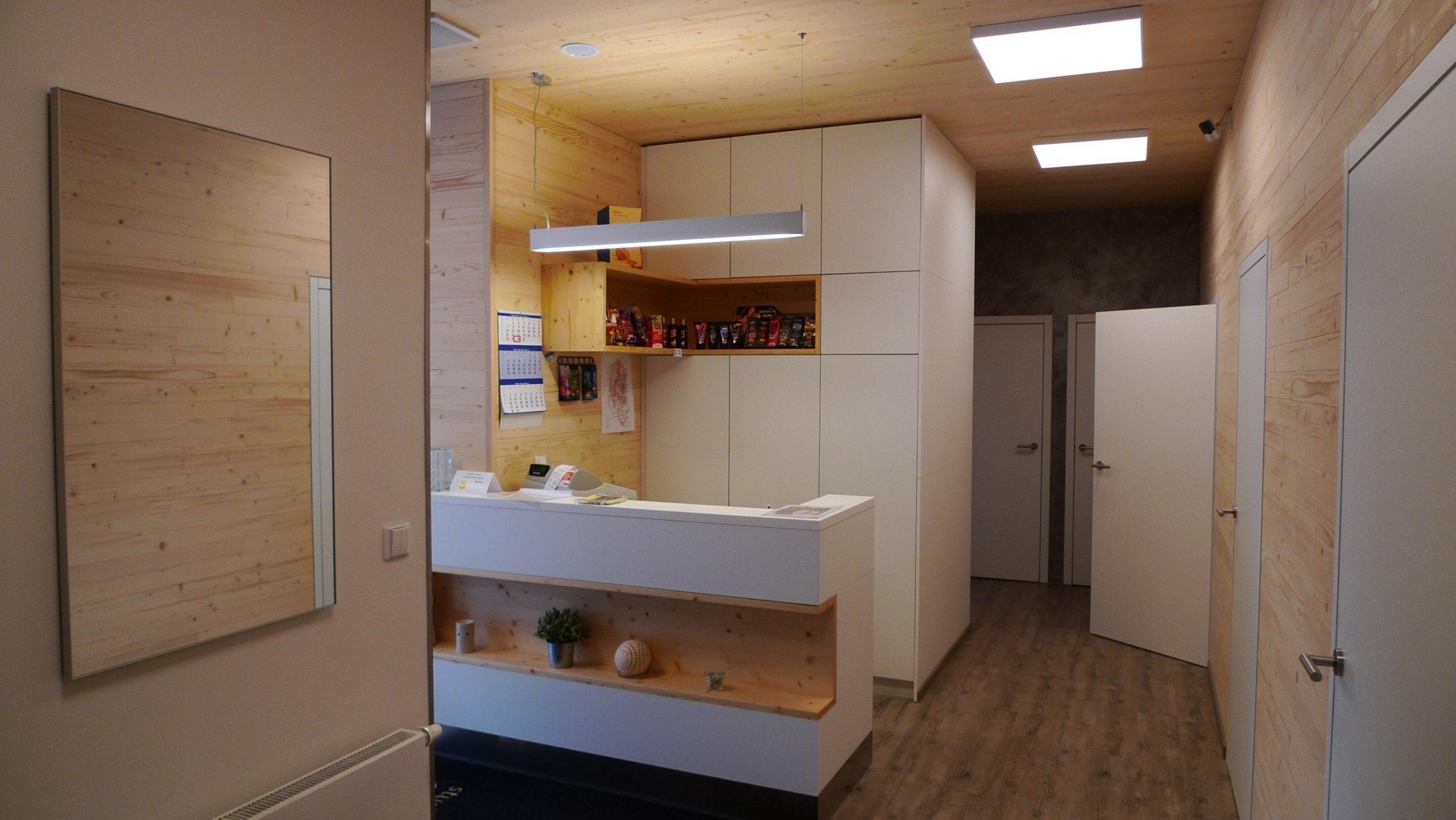 Mám radost z toho, když nás klienti oslovují znovu a znovu. Je to jasný důkaz toho, že práci, kterou pro ně odvádíme je perfektní a to nás těší. A tak se stalo, že jsme byli požádáni o spolupráci na kompletní rekonstrukci Fit Studia Aura ve Frenštátě pod Radhoštěm jakožto generální dodavatel. Samozřejmě nápadů máme vždy mnoho, ale hned ten první se investorům zalíbil. Naše idea byla vše předělat do čistě skandinávského stylu. Bělené dřevo, bílé plochy, jednoduchost a vzdušnost a hlavně praktičnost v neposlední řadě. Několik měsíců jsme postupně vyvářeli vizualizace jednotlivých pokojů vč. originálního nábytku a vybavení.. Následoval výběr materiálů, zařizovacích předmětů, obkladů, podlahové krytiny, světel atd. atd. A potom naběhli silní chlapi a začalo se bourat. To je fáze, kdy stavba vypadá hrozně. A pak se postupně začne tvořit nový "čistý" prostor. To každému zvedne náladu a práce jde od ruky. Na stěnách jsme tedy zvolili obklad z olejem běleného smrku v kombinaci s tmavě šedou stěrkou Oikos Encanto a bílým lesklým obkladem. Výtečná kombinace, nemůžeme se na to vynadívat. Jednotlivé příčky jsme odhlučnili akustickými deskami v kombinaci s geotextílií. Na podlaze je vinyl clik 5 mm od Gerfloru. Dveře jsou z HPL 1 mm bilá matná, padací prahy, protizvuková výplň, zarubně na tupo, bezfalcové provedení, které lícuje se zdí. Na stropech jsou LED panely a infra panely. Nábytek je také z bílé HPL, která vydrží vše. A dost psaní. Fotek je málo, kabinky a masérny jsou stále plné. Mrkněte a výsledek.