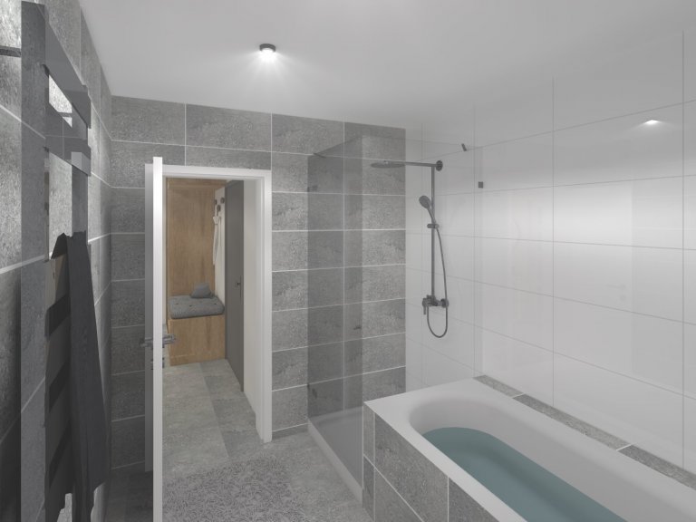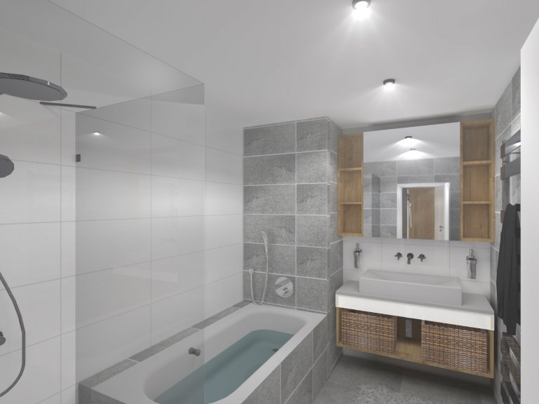 Díky dispoziční změně, tedy posunutím toalety a přemístění vstupu do koupelny, bylo možné i v takto malém panelákovém bytě vytvořit pohodlnou koupelnu, do které šlo umístit jak vanu, tak i sprchový kout.