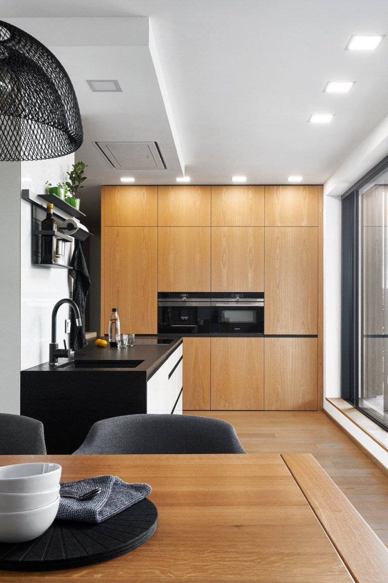 Interiér vyrobený na míru, kombinace dýhy s lakovaným nábytkem je opravdu nadčasovou a designovou záležitostí. Realizovat interiér s jedním výrobcem se skutečně vyplatí.