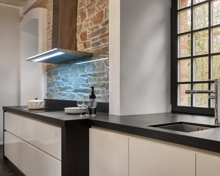 Rustikální a moderní kuchyně ve stylovém bydlení. Kuchyně MILANO a její typická profilovaná dvířka s ruční jemnou patinou a dalšími rustikálními prvky v kontrastu s moderní kuchyní LINE.
