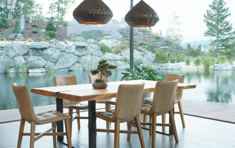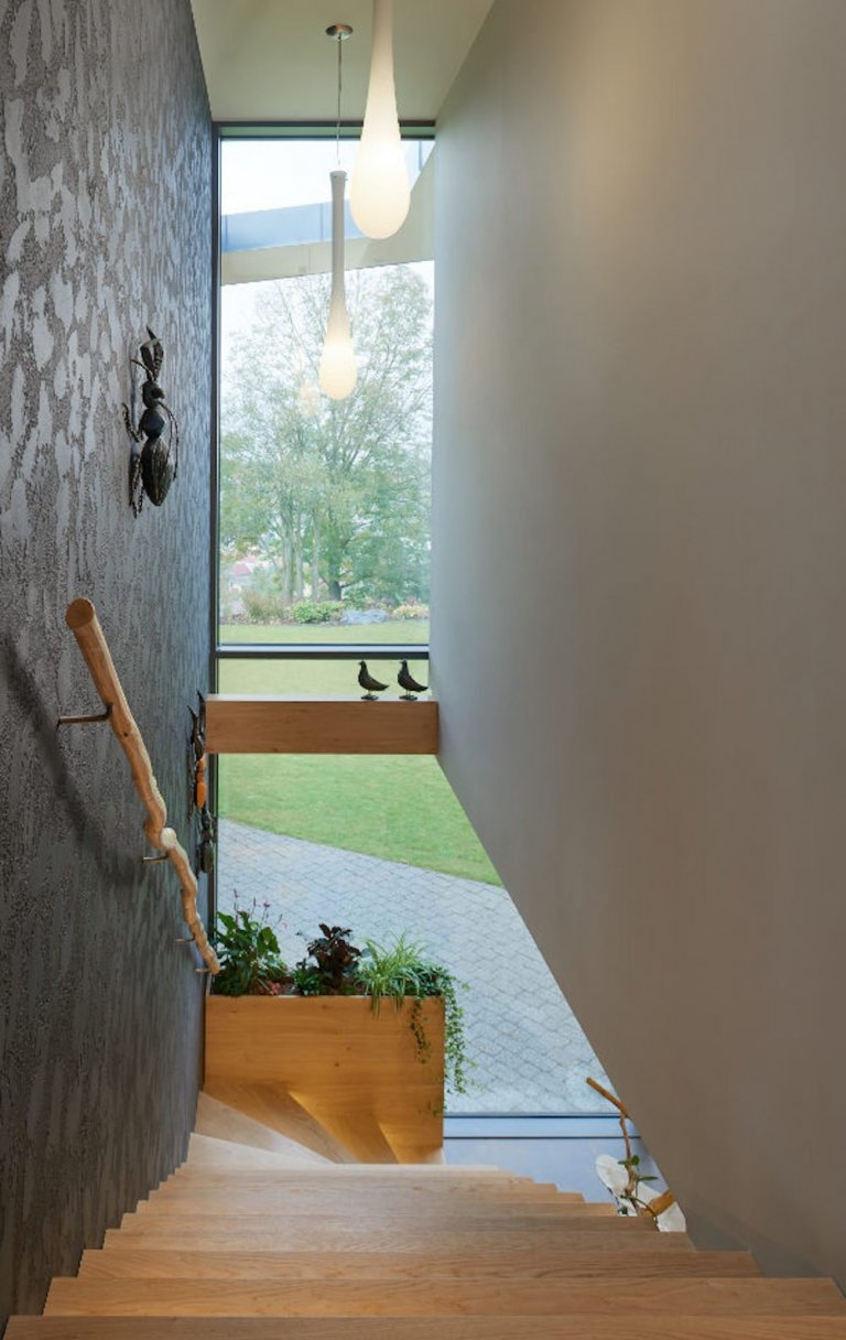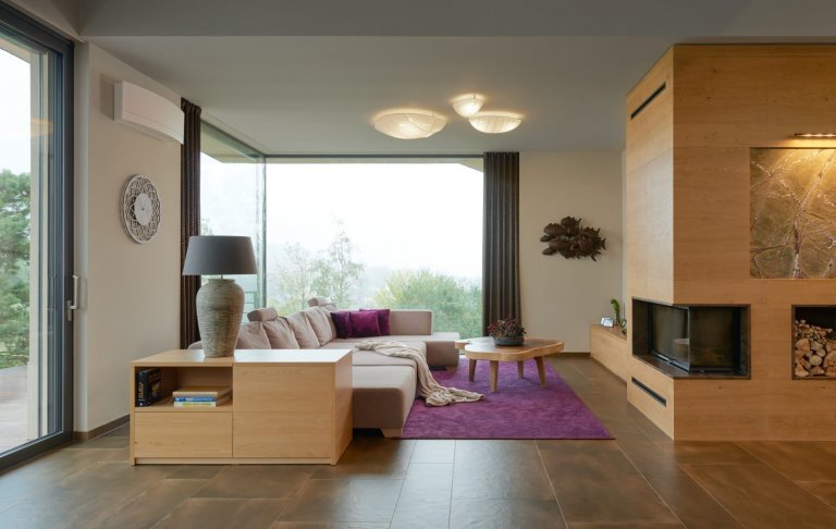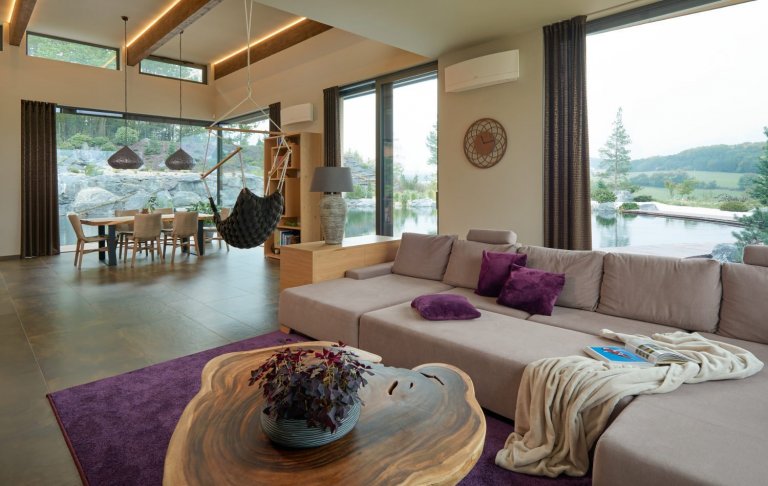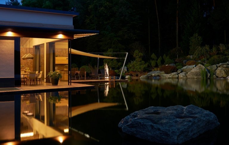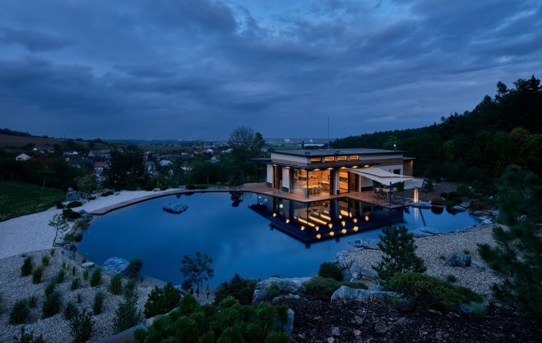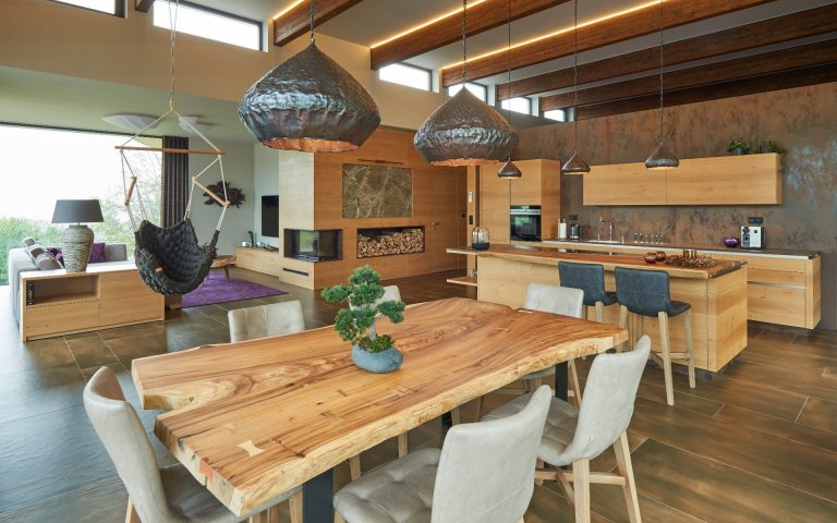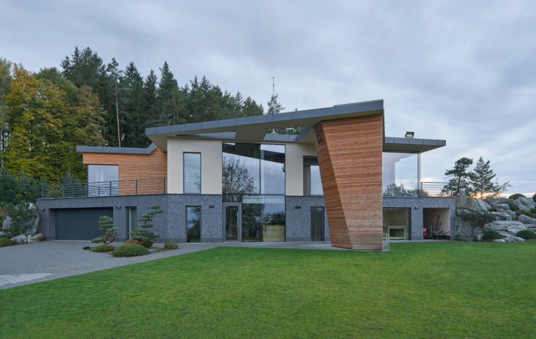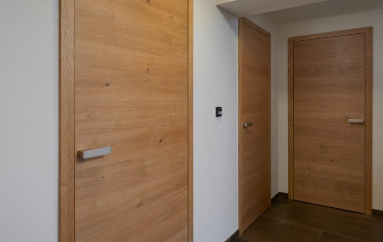 Krásný dům situovaný v nerušené přírodě. V hlavní roli této realizace je zvolený materiál. A to dýha dub rustikální přírodní s jemnou strukturou dřeviny a medovým tónem. Tento materiál se prolíná celým domem. Efektní je mimo bezúchytkové kuchyně ELITE i dlouhá obložená stěna s integrovanými dveřmi. Extra požadavkem v rámci dodávky dveří bylo zhotovení speciálních dveří do výtahu a schodiště. Schodiště je dokonce pro větší efekt podsvětlené. Přímo u domu si majitel vybudoval větší jezírko, které je další chloubou tohoto pozemku.