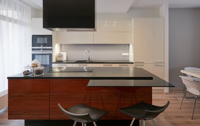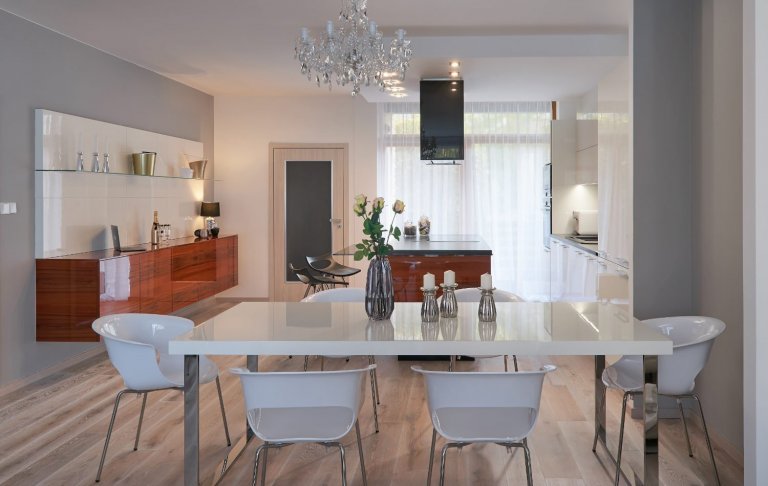 Kuchyni LINE vyniká především zvoleným materiálem. Kromě krásného lesklého bílého laku je to ušlechtilá dýha Tineo, která se prolíná v otevřeném prostoru. J epoužita na příborníku naproti ostrůvku. S dostatečným úložným prostorem i příjemnou odkládací plochou včetně skleněné police.