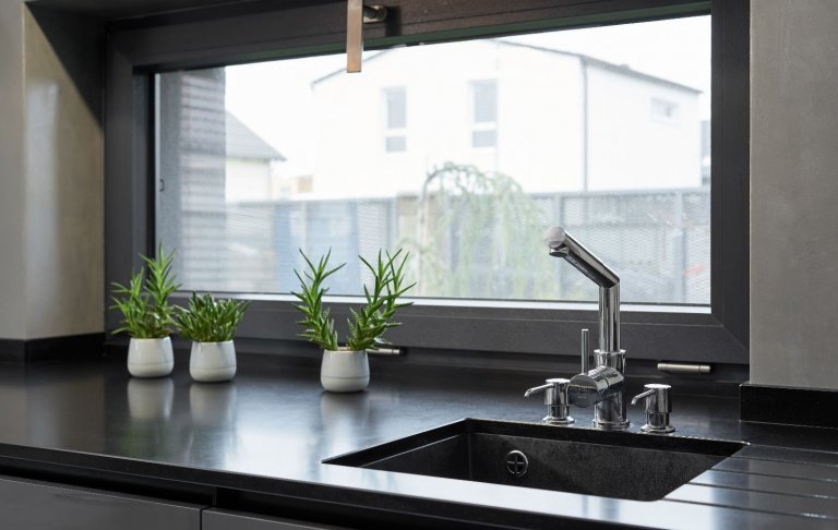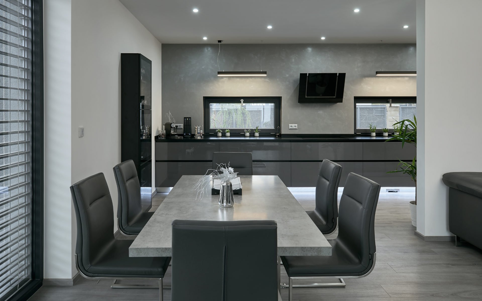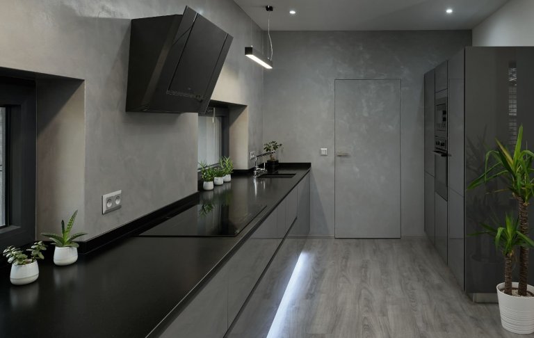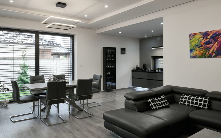 Osobitý interiér, kterému vládnou barvy šedi. Šedé odstíny zde převládají nejen na nábytku, ale i na výmalbě nebo podlahách.