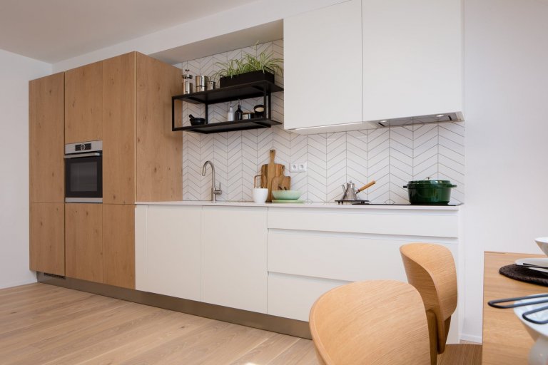 I do malého podkrovního bytu umíme vykouzlit zázraky. Dubová dýha s kombinací bílého laku v matu, prostor opticky otevřela a rozzářila. Kuchyně je promyšlená do nejmenšího detailu a působí tak velmi harmonicky a nadčasově.