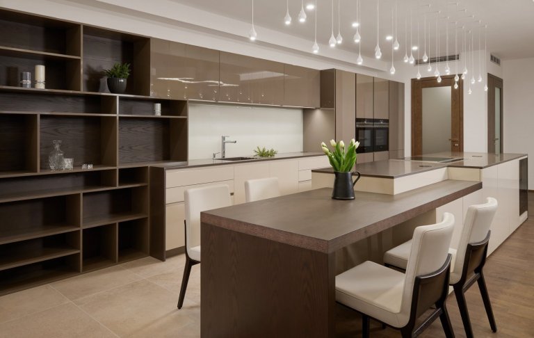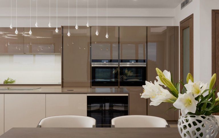 Interiér je vybaven moderně a nadčasově a nábytek v obývacím pokoji koresponduje s kuchyňskou sestavou. Elegantní kuchyni ELITE v sobě skrývá tři různé dekory. V této sestavě byly použity dva aktuálně velmi oblíbené laky ve vysokém lesku, ke kterým je doladěna dýha jasan hnědý. Tato dýha se promítla i do jídelního stolu. Ve stejném provedení je také komoda s efektními otevřenými nikami a samozřejmě interiérové dveře.