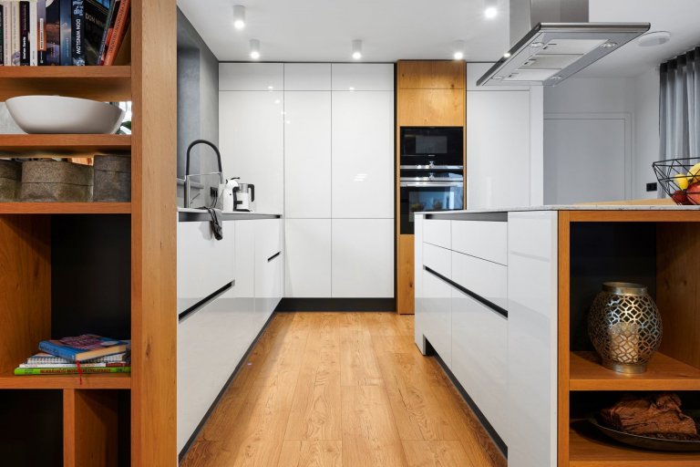 Moderní a útulné bydlení pro mladou rodinu v nadčasové kombinaci přírodní dýhy a bílého laku. Luxusní kuchyně v kombinaci přírodní dýhy dubu rustikal OLD s bílým lakem orion ve vysokém lesku. Spotřebiče jsou značky Siemens. Čisté linie a dokonalý design utváří celkovou atmosféru interiéru. Nadčasová kombinace dýhy a bílého laku je vždy sázkou na jistotu. Designové, ale také praktické prvky v interiéru dotváří jeho celkovou atmosféru.