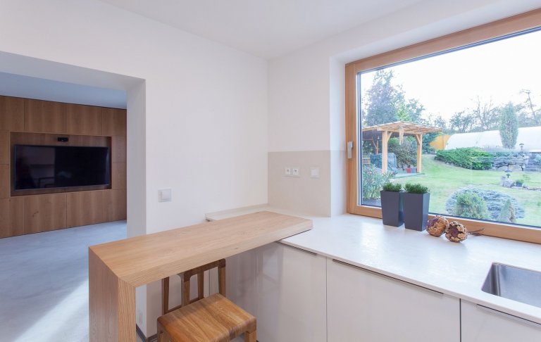 Dům je zařízen velmi jednoduše, jak napoví řada fotografií. Nábytek je v kombinaci bílého laku s dýhou dub rustikální přírodní.
