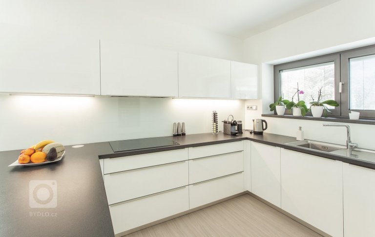 Kuchyně má velmi příjemnou ergonomii. Má dostatečnou pracovní plochu, blok vysokých skříní a horní nízké skříňky. Tedy celkově dostatek prostoru pro pohyb i uložení nádobí a potravin.