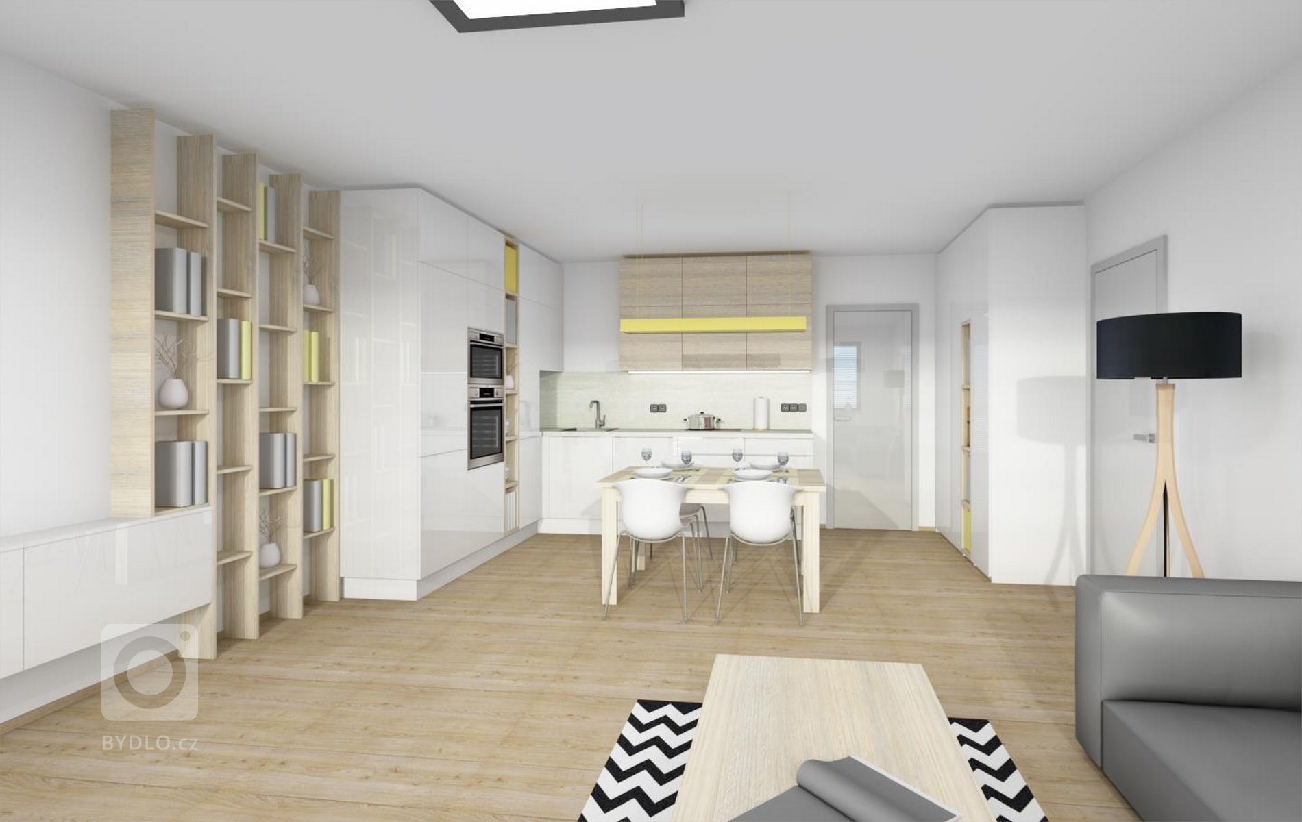 Kuchyňská linka spojená s obývacím pokojem v novostavbě o dispozici 2+kk. Kombinace bílého laku a dřeviny v podob dubu chamoniex.