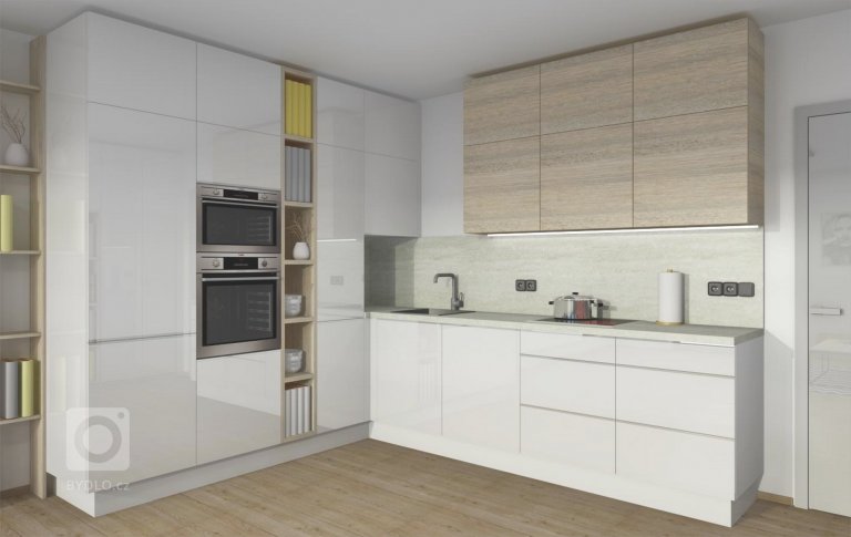 Kuchyňská linka spojená s obývacím pokojem v novostavbě o dispozici 2+kk. Kombinace bílého laku a dřeviny v podob dubu chamoniex.