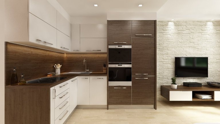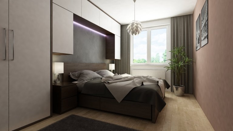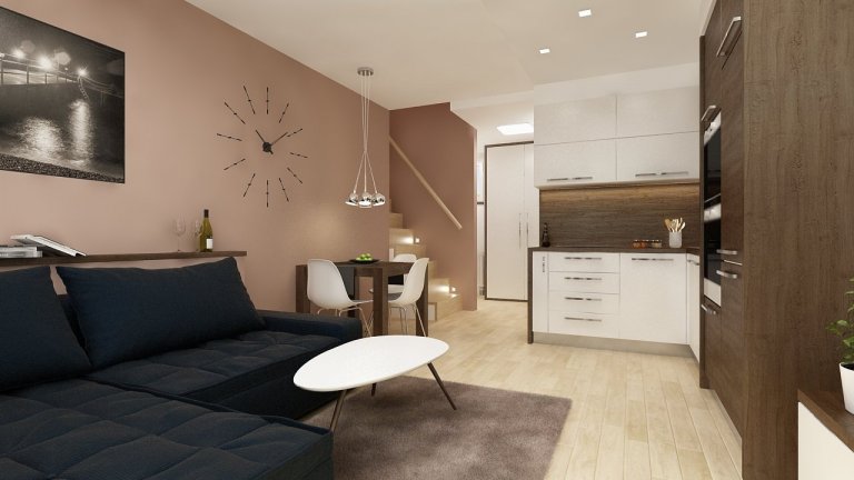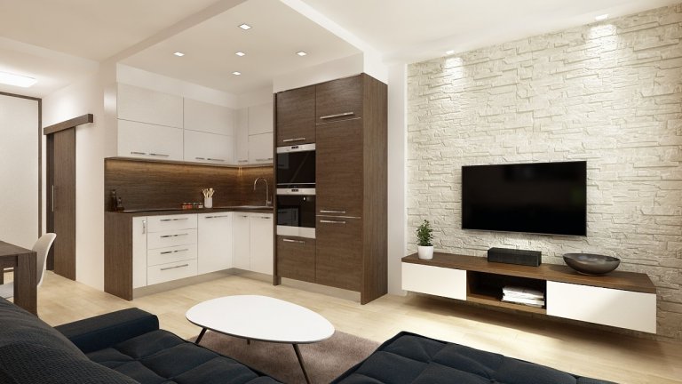 Byt se skládá z ložnice a obývacího prostoru. V hlavním obývacím prostoru na sebe navazují tři funkční zóny - kuchyňský kout, jídelní prostor a obývací část. Tyto praktické zóny jsou velkou výhodou, protože ztvárňují dokonale sladěný celek. Kompaktní kuchyně v sobě spojuje praktické využití s komfortem a elegancí, je vyrobena z materiálu lamino (LTD) v dekoru dřeva tmavý dub a bílý lesk. Kuchyně disponuje různými otvíracími systémy, vestavěnými spotřebiči a je uspořádaná do "L". Na malém prostoru a ve stylovém designu budete mít vše na dosah ruky. Jídelní prostor je místo, kde si můžete s přáteli vychutnat své pokrmy u společného stolu, který je vyroben z materiálu lamino (LTD) v dekoru dřeva tmavý dub. Obývací část se sedací soupravou s čalouněním v černé barvě je ideálním místem pro odpočinek. V centru místnosti je umístěný otočný panel s TV a pod ní umístěný moderní stolek. Ložnice je vybavena 2-dvéřovou skříní, kde najdete poličky a šatní tyč pro perfektní organizaci Vašich oděvů. Dále zde najdeme úložný prostor s vyklápěcími dvířky, dva noční stolky a dvoulůžkovou postel se zvýšenou ložní plochou pro usnadněné vstávání, která navíc obsahuje praktické zásuvky. Vše je vyrobeno z materiálu lamino (LTD) v dekoru dřeva tmavý dub a bílá matná. Celý byt je nejen chytře vyřešený, ale především perfektně sladěný, útulný a díky rovným liniím působí čistě a přehledně.