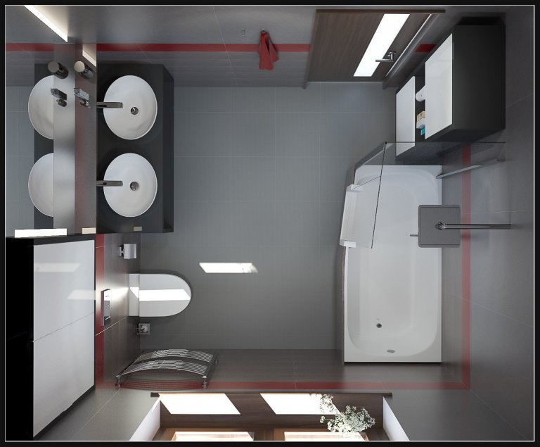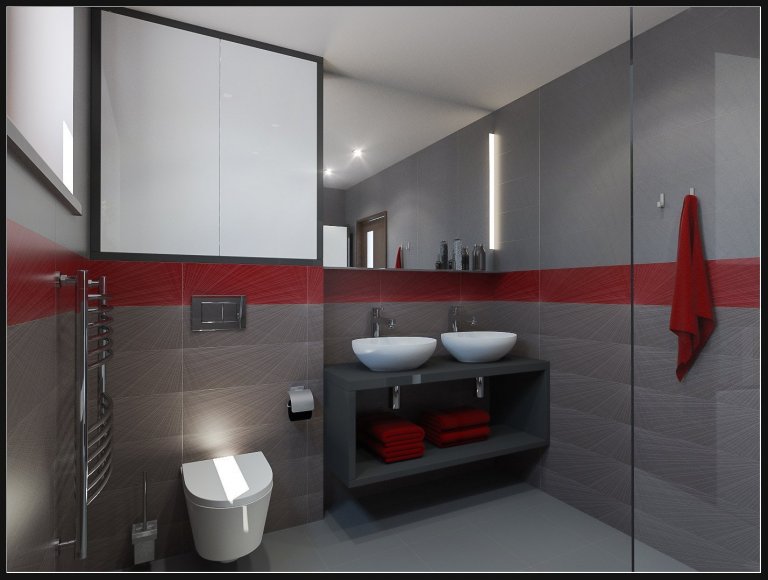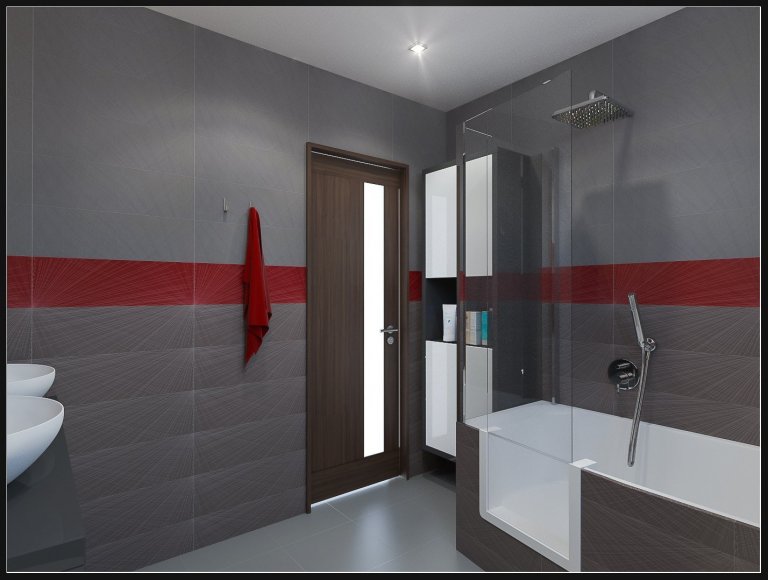 Koupelna je celá obložená šedou velkoformátovou dlažbou, která přispívá k elegantnímu vzhledu i ke snadnému udržování čistoty. Velká zrcadlová stěna nad umyvadlem a praktické skříňky z materiálu lamino (LTD) v dekoru dřeva tmavý dub a bílá lesklá. Koupelnový nábytek je odolný, vysoce funkční a dokonale sladěný. Prostorná skříňka pod umyvadlem snadno ukryje všechny potřebné drobnosti.