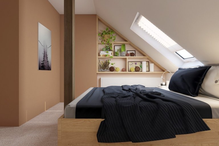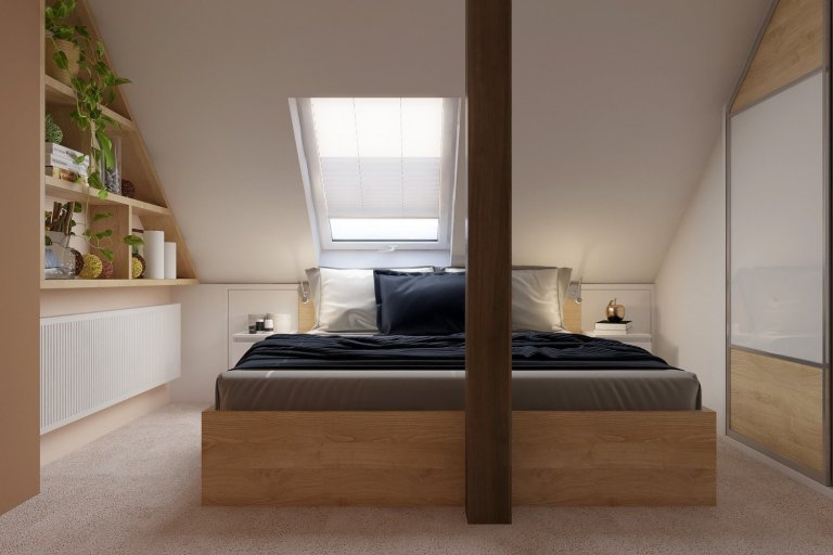 Podkrovní ložnice mají své kouzlo právě díky střešním šikminám - pro někoho nepraktické, pro jiného útulné. Dominantním prvkem celého prostoru je dvoulůžková postel se zvýšenou ložní plochou pro usnadněné vstávání a je vyrobena z materiálu lamino (LTD) v dekoru dřeva světlý buk. Na každé straně postele je noční stolek, který obsahuje dvě praktické zásuvky a je vyrobený z materiálu lamino (LTD) v dekoru dřeva bílý lesk.
