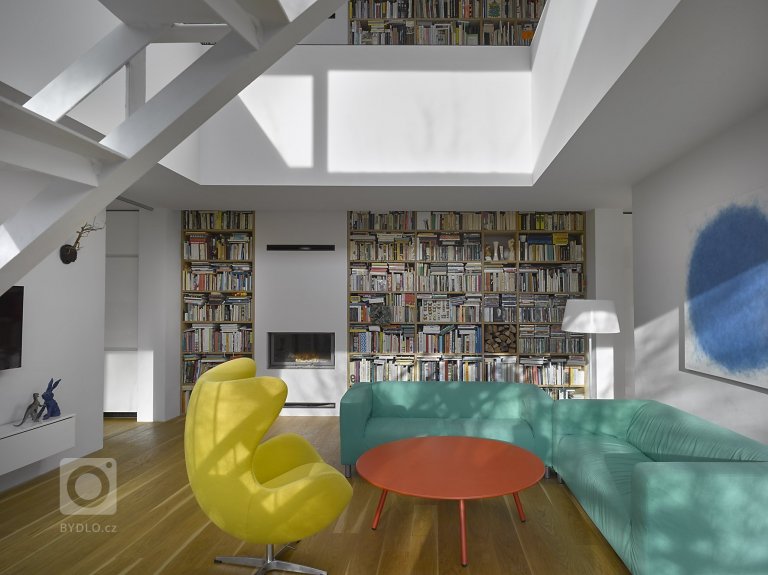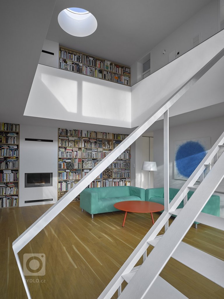 Do domu se musí vejít mých několik tisíc knih, chceme snídat na zahradě, měla by tu být moje pracovna a auto může stát před domem.. Projekt se vydal koncepcí hry s analogií bílého listu papíru, který si bude rodina postupně sama dobarvovat svou prací, sbírkou umění svých přátel výtvarníků aj. / paní domu Šárka Bulčíková pracuje s porcelánem v zahradním atelieru domu, syn Eda se baví fotografií../ Dům je uzavřený směrem do veřejného prostoru, avšak maximálně otevřený do zahrady jihozápadní orientace. Dominantu interiéru tvoří knihovna prorůstající přes dvě podlaží s vestavěným krbem a tři kruhové světlíky na stropě. Světlíky přivádějí do domu více denního světla, zároveň umožnují rodině noční průhledy na hvězdnou oblohu z pohovek pod nimi. Počet světlíků tvoří analogii členů rodiny žijících v domě. Petr je otevíratelný směrem na střechu, Šárka a Eda jsou „napevno“. V prvním podlaží domu je kuchyně s jídelnou navazující na hlavní obytný prostor, který je možné posuvnými dveřmi opticky oddělit. Dále je zde prádelna, sklad