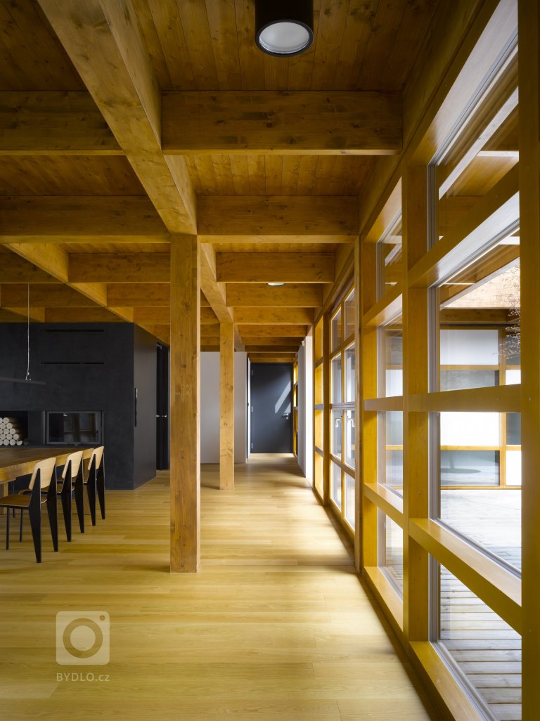 Dřevostavba jednopodlažního rodinného domu umístěného do mírně svažitého pozemku v Tehově u Prahy. Hlavním prvkem domu tvoří centrální vodní plocha osazena lekníny a další rostoucí vegetací, která začíná dům přirozeně usazovat a propojovat s okolím. Obytná část vodní plochu z její tří stran uzavírá a je s ní v přímém kontaktu. Koncepce domu umožňuje jeho uživatelům neustálý pohyb mezi exteriérem a interiérem. Dům mohou opustit a zase se do něho vrátit ze všech světových stran. Hmota má mimo centrální vodní hladiny ještě další tři vnitřní atria které jsou osazeny různými typy dřevin a rostlin kvetoucích v rozdílném časovém období. Domem se začínají přirozeně prolínat různé intenzity měnících se vůní a barev.