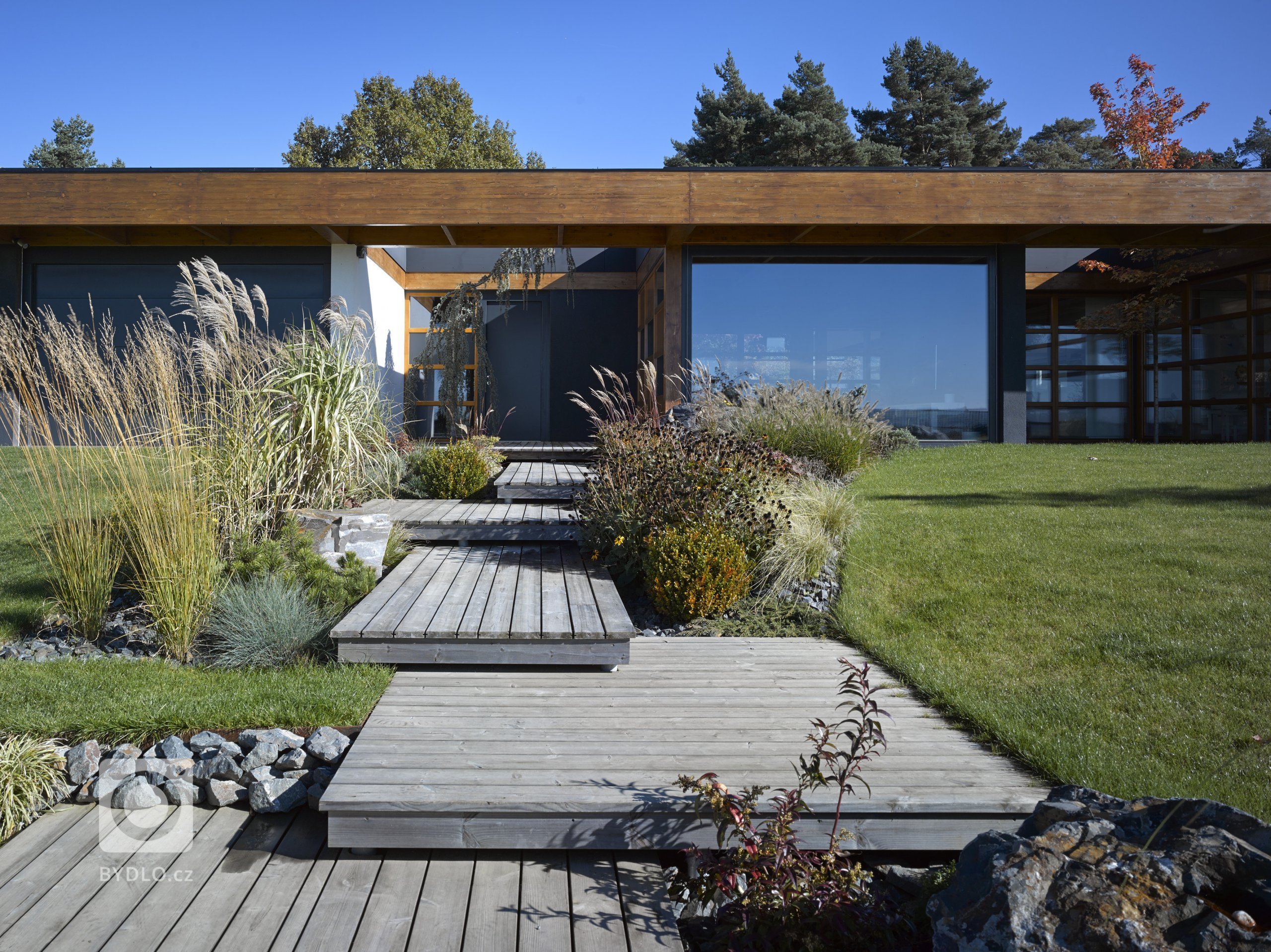 Dřevostavba jednopodlažního rodinného domu umístěného do mírně svažitého pozemku v Tehově u Prahy. Hlavním prvkem domu tvoří centrální vodní plocha osazena lekníny a další rostoucí vegetací, která začíná dům přirozeně usazovat a propojovat s okolím. Obytná část vodní plochu z její tří stran uzavírá…