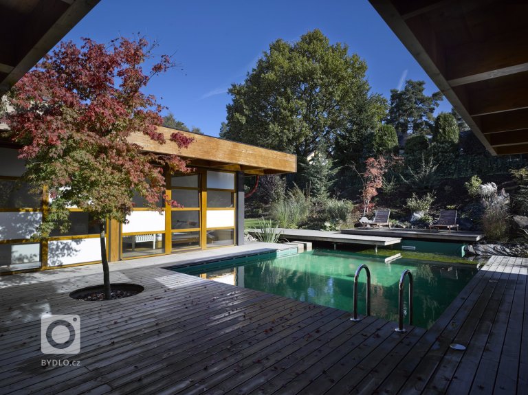 Dřevostavba jednopodlažního rodinného domu umístěného do mírně svažitého pozemku v Tehově u Prahy. Hlavním prvkem domu tvoří centrální vodní plocha osazena lekníny a další rostoucí vegetací, která začíná dům přirozeně usazovat a propojovat s okolím. Obytná část vodní plochu z její tří stran uzavírá…