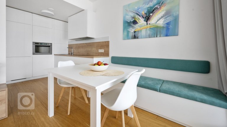 Realizace bytu v Panorama City v Bratislavě. Světlý dekor nábytku prolnutý dubovými prvky a nadčasovým designem vytváří koncpet útulného bytu.
