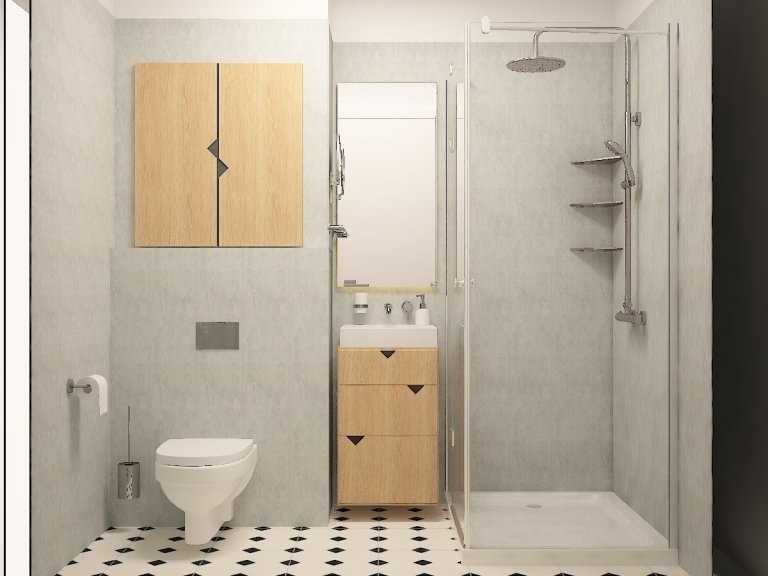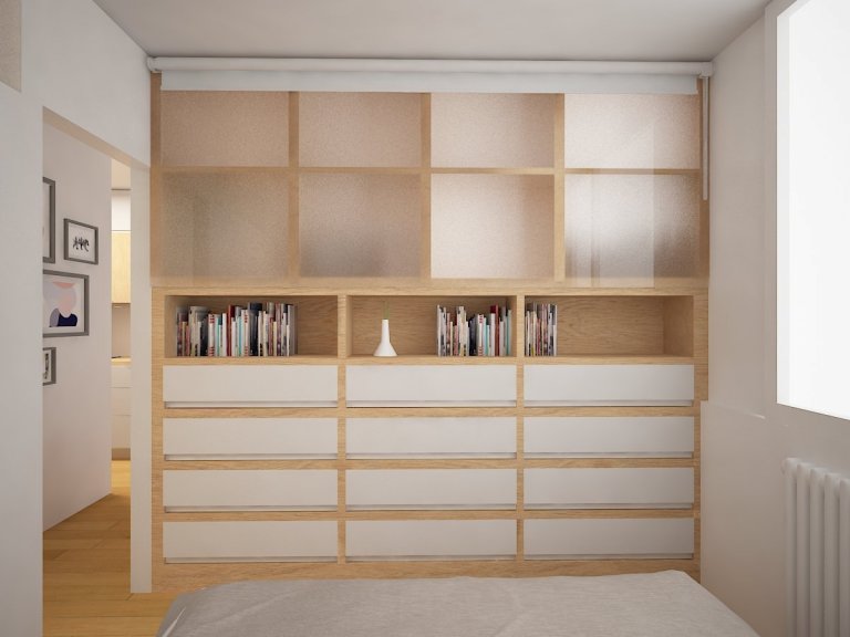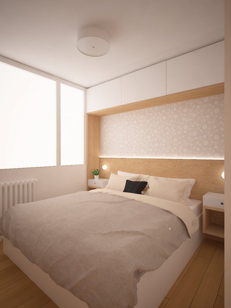 Rekonstrukce panelového bytu v Praze. Ze stávající díspozice 1+KK jsme přidáním ložnice vytvořili 2+KK. Obývací pokoj je ve výsledku malý, ale pro 1-2 osoby dostačující. Dřevěné prvky jsou doplněny bílým laminem a spolu s dubovou podlahou vytváří příjemný a útulný prostor.