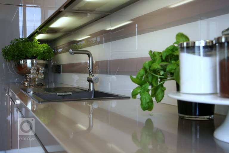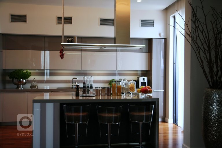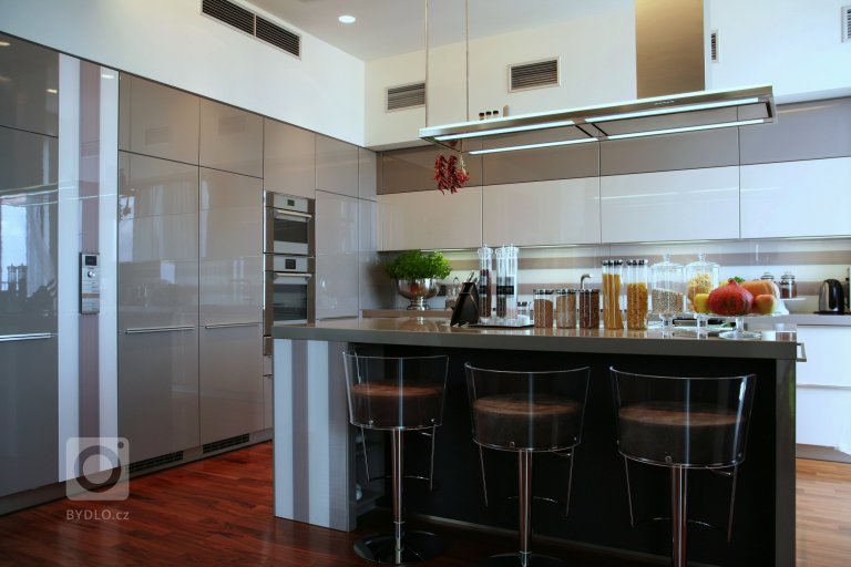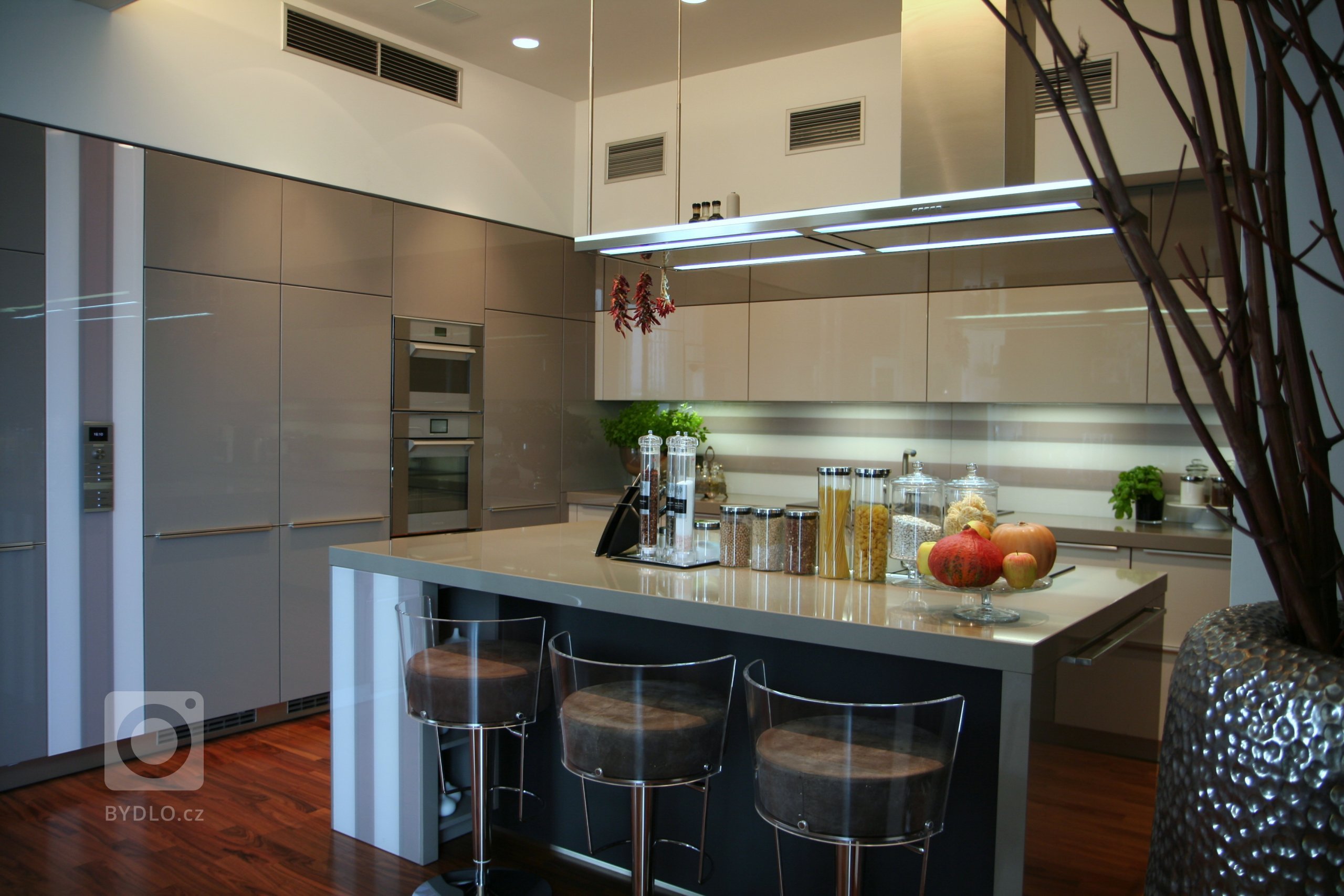 Kuchyně SCHÜLLER GALA - Sestava ve vysokoleském laku, ostrůvek s varným centrem, pracovní desky z technického kamene. Spotřebiče značky De Dietrich a Falmec. Realizace v roce 2013. Celková…