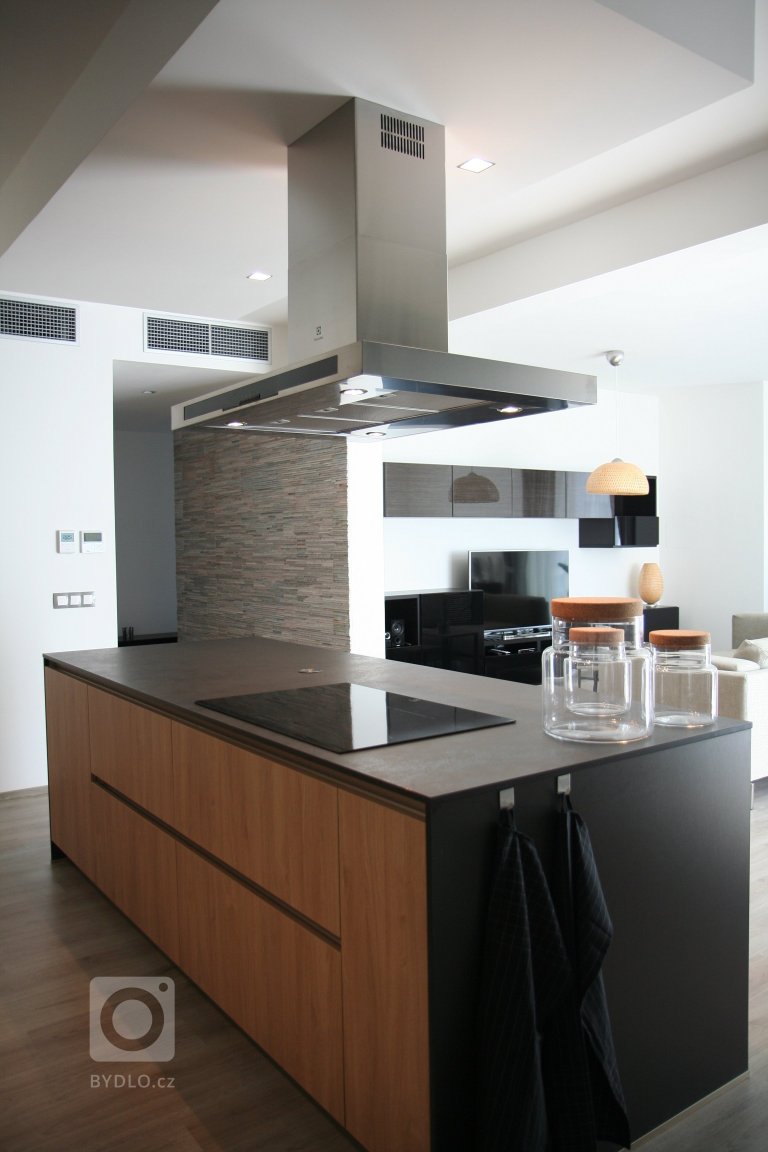 Další z našich realizací, tentokrát ve vzorovém bytě pražského developera. Imitace dubu v kombinaci s lakem Unigloss ve vysokém lesku. Kuchyň je vybavena spotřebiči značky Electrolux.