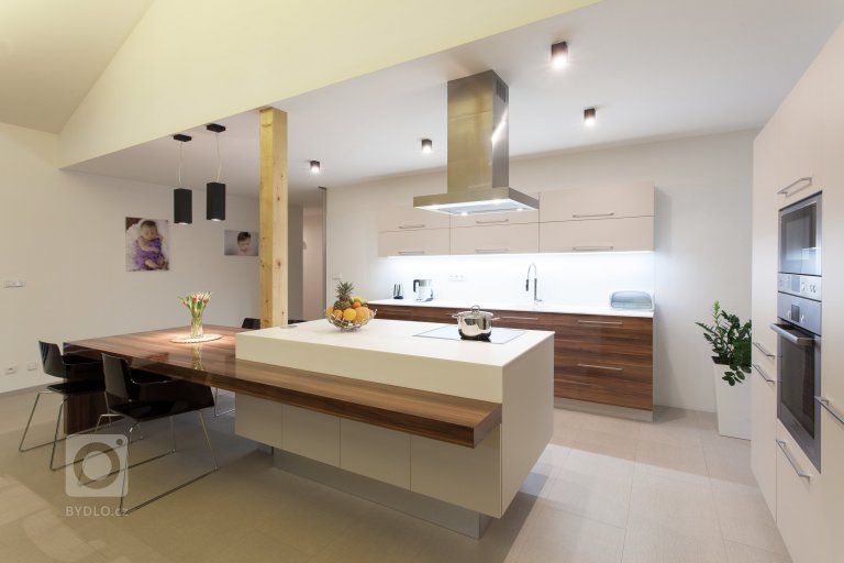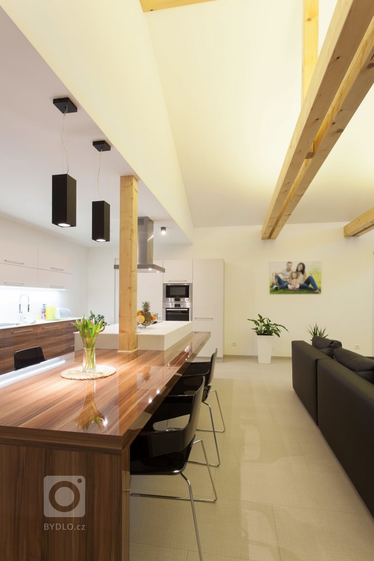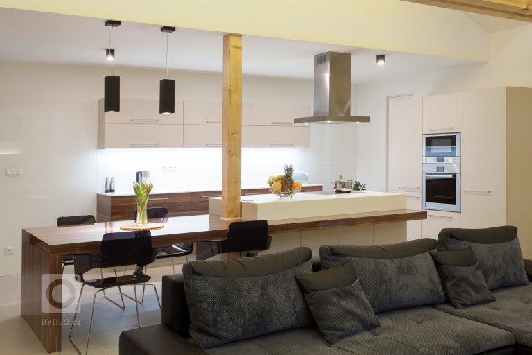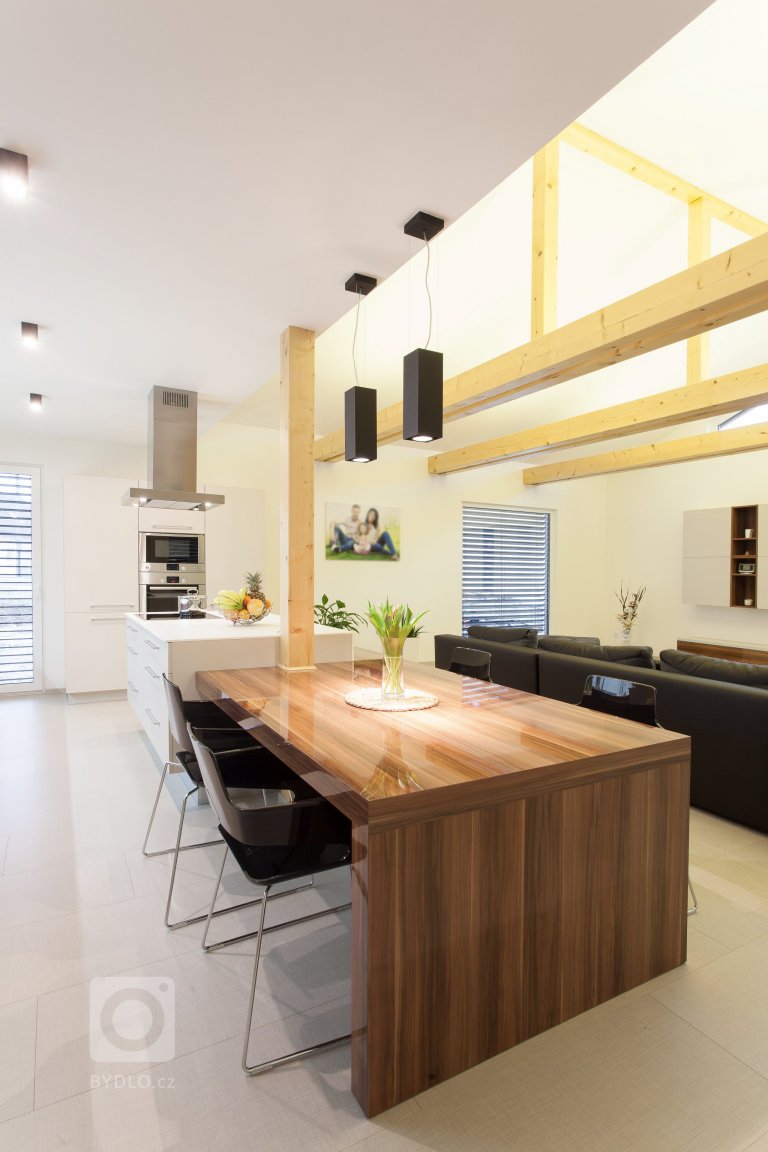 Zapuštění jídelního stolu spojuje neoddělitelně funkční prostory kuchyně a jídelní části, což poskytuje rodině možnost být v neustálém kontaktu. Ostrůvek a jídelní stůl jsou spojeny s jedním z masivních trámů. Přiznané dřevěné trámy otevřeného stropu prolínají celý prostor interiéru a jsou dominantním jednotícím prvkem. Kuchyňská linka je osvětlena led páskem na senzorické ovládání.