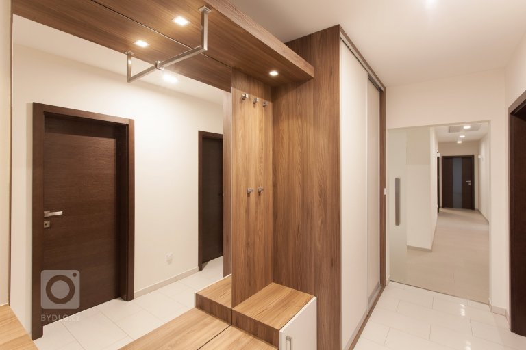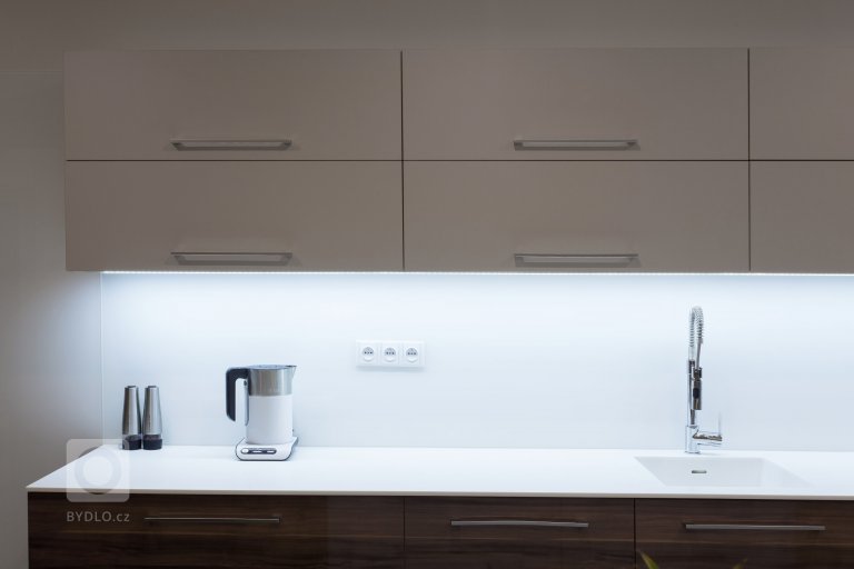Nadčasovost se skrývá v jednoduché barevnosti prostoru, která je řešena kombinací bílé, černé a dvou tónů hnědé. Při realizaci byly využity nadstandardní materiály; kuchyňská pracovní deska se dřezem zapuštěným bez viditelných spojů je vyrobena na míru z umělého kamene, desky stolů a kuchyňská dvířka pak z odolného vysokotlakého laminátu imitujícího masivní dřevo.