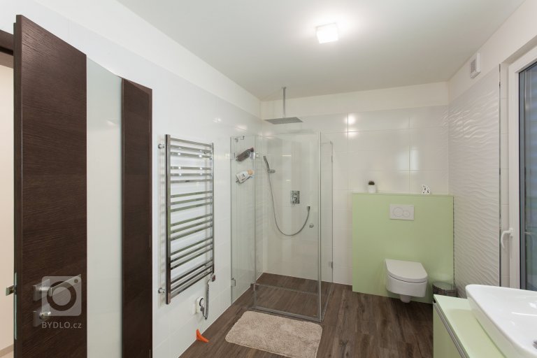 Koupelna je vybavena typovým minimalistickým proskleným koutem. I zde byla zachována střídmá barevnost a kombinace hnědé a bílé barvy. Bílé tóny jsou ozvláštněny obkladem se vzorkem vlnek připomínajících vodu. Vana je pozdvižena na relaxační centrum díky nice zapuštěné v obkladu a tlumenému osvětlení LED pásků a svíček. Z důvodů komfortu používání je koupelna koncipována se dvěma umyvadly.
