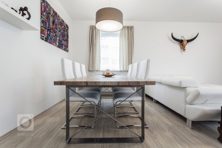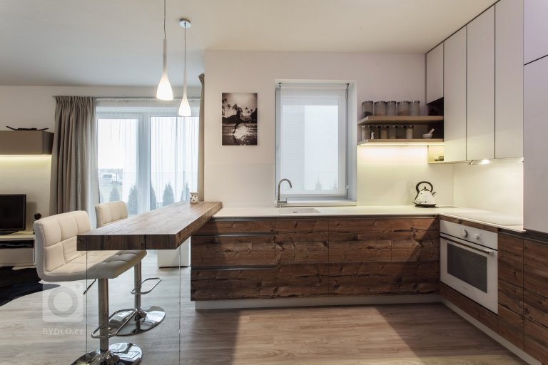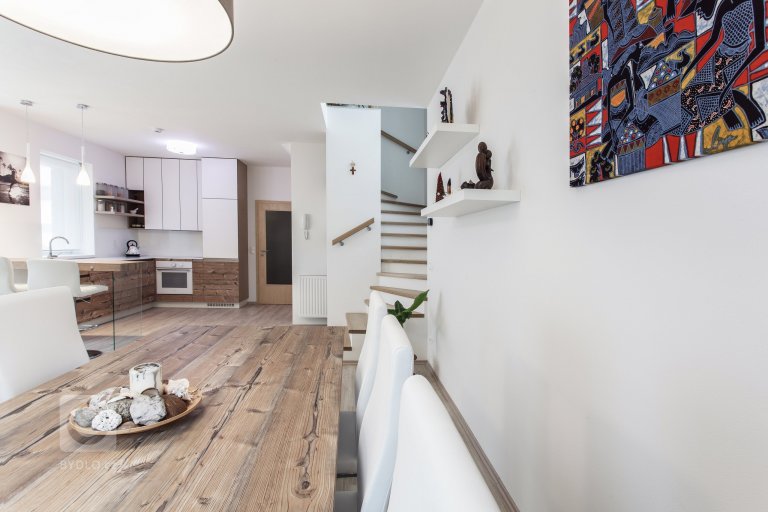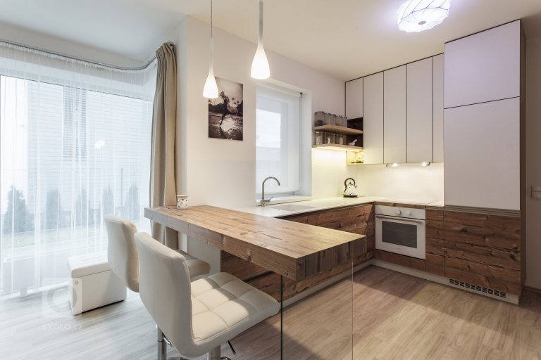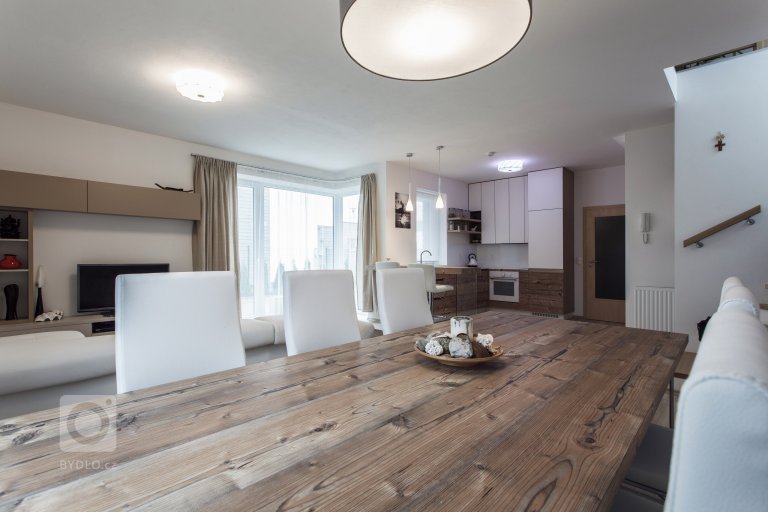 Prostor plní funkci kuchyně, jídelny i relaxační zóny. K zajištění vzdušnosti celého prostoru byla využita skleněná noha kuchyňského ostrůvku, který díky tomu působí jako by se vznášel ve vzduchu. Podstata spočívá v jednoduchosti a proudění energie v celém prostoru, proto by jí nemělo v cestě nic překážet. Osvětlení celého prostoru je koncipováno dle jednotlivých zón. Při volbě materiálu kuchyňské pracovní desky byl zvolen umělý kámen, který umožňuje zapustit kuchyňský dřez bez viditelných spojů a vyniká svým minimalistickým designem, čistotou a jednoduchou údržbou. Právě umělý kámen umožňující atypické tvary pracovních prostorů rádi využíváme v našich projektech. Přáním majitele bylo umístění velkoryse pojatého jídelního stolu. Tento stůl jsme navrhli a vyrobili na zakázku a pojmenovali jej podle jména svého prvního majitele „Davide“.