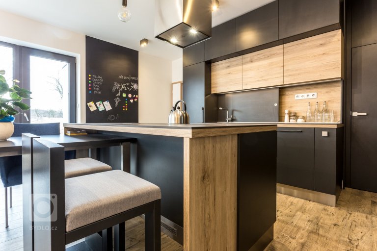 Interiér s nádechem skandinávského stylu. Nábytek včetně pohovky vyroben na zakázku. Pracovní deska z extrémně odolné velkoformátové keramiky Neolith, Osvětlení Nordlux, podlahy vinyl, dveře Porta…