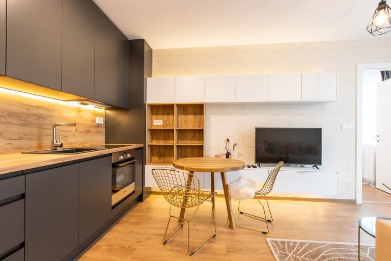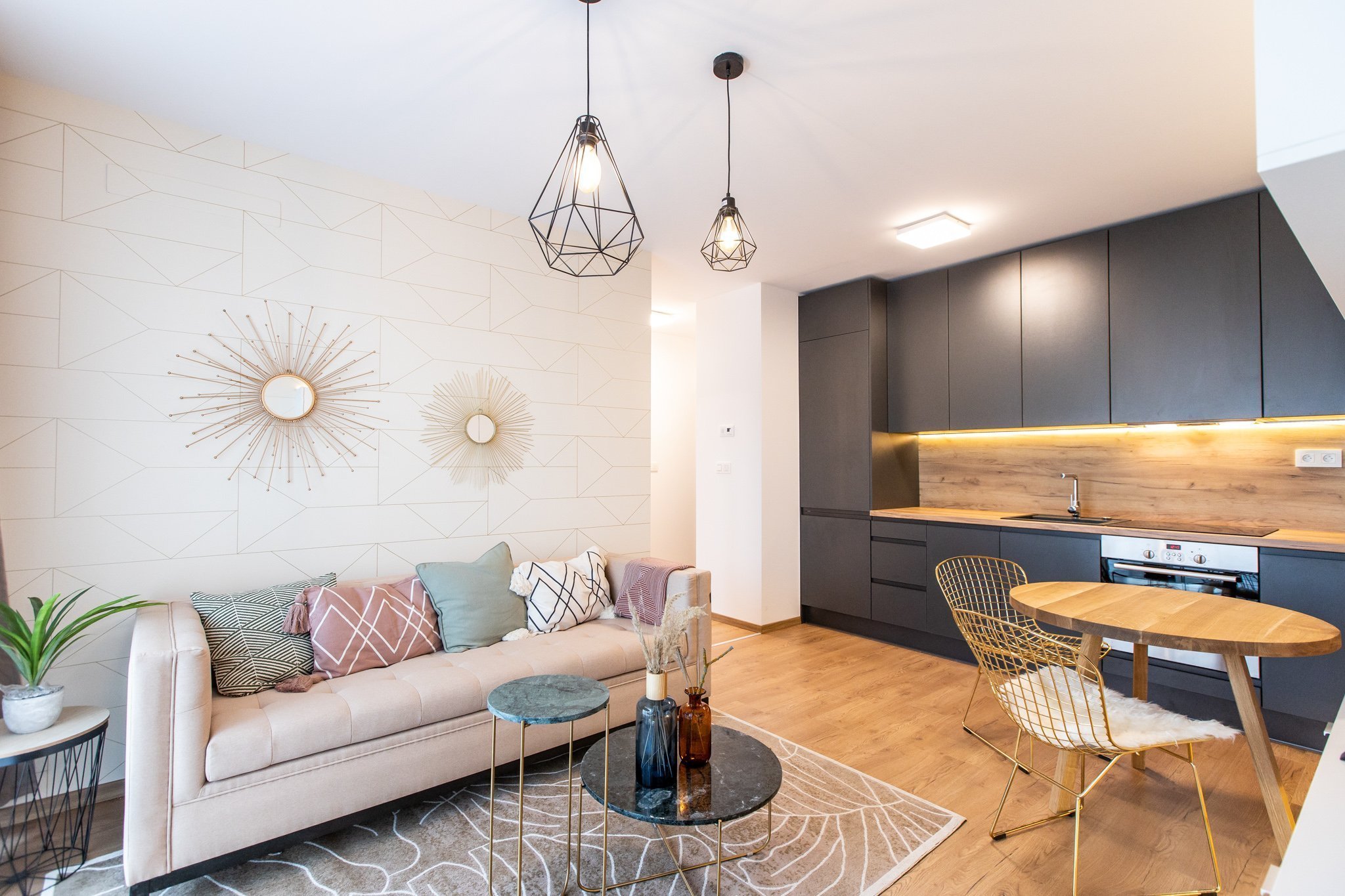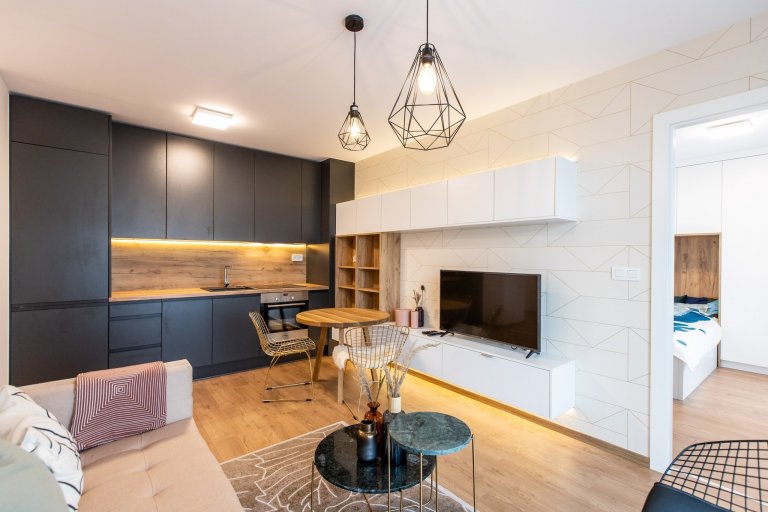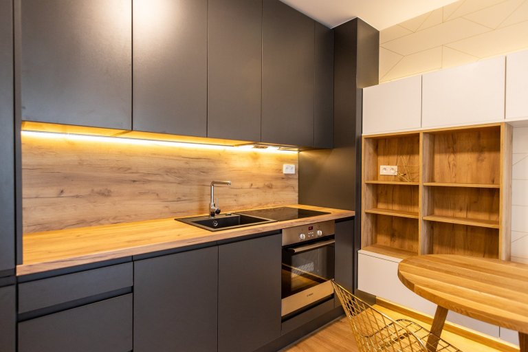 Krásna realizácia, ktorá dokonale prepája antracitovú kuchyňu s bielou obývacou zostavou.