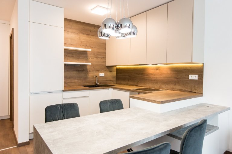 Kuchynská linka priamo prepojená s jedálenským stolom veľmi efektívne rieši kuchynský a obývačkový priestor